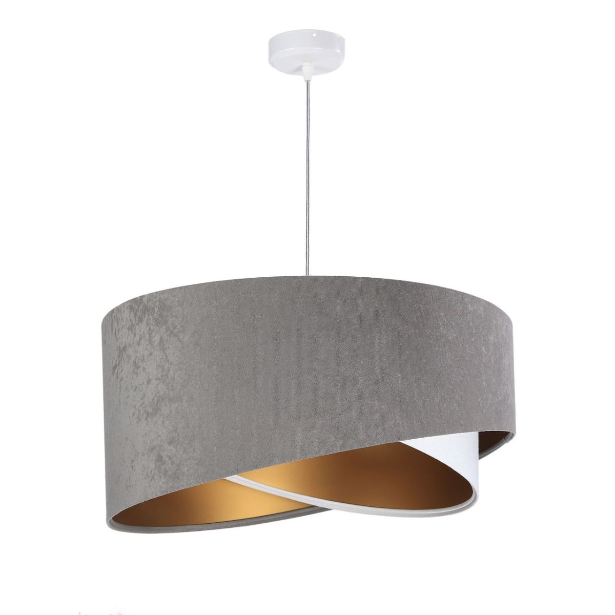 Lampenschirm aus Stoff (Mikrofaser) auf PVC-Kunststoff mit goldener Mitte. Parameter der Fassung: 1 x E27 max. 60 W. Parameter der Deckenrosette: Kunststoff, Maße 10 cm x 2 cm. Kabellänge: max. 80 cm, verstellbar. Farbe des Kabels: transparent. LED-Glühbirnen können verwendet werden.