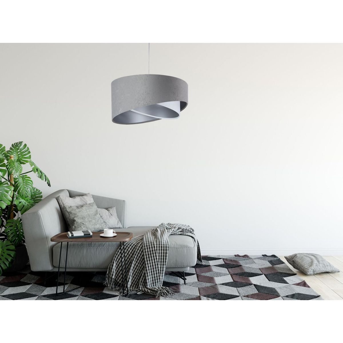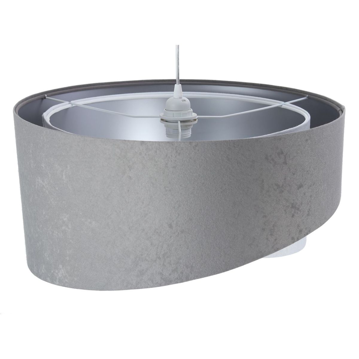 Lampenschirm aus Stoff (Mikrofaser) auf PVC-Kunststoff mit silbernem Mittelteil. Parameter der Fassung: 1 x E27 max. 60 W. Parameter der Deckenrosette: Kunststoff, Abmessungen 10 cm x 2 cm. Kabellänge: max. 80 cm, verstellbar. Farbe des Kabels: transparent. LED-Glühbirnen können verwendet werden.