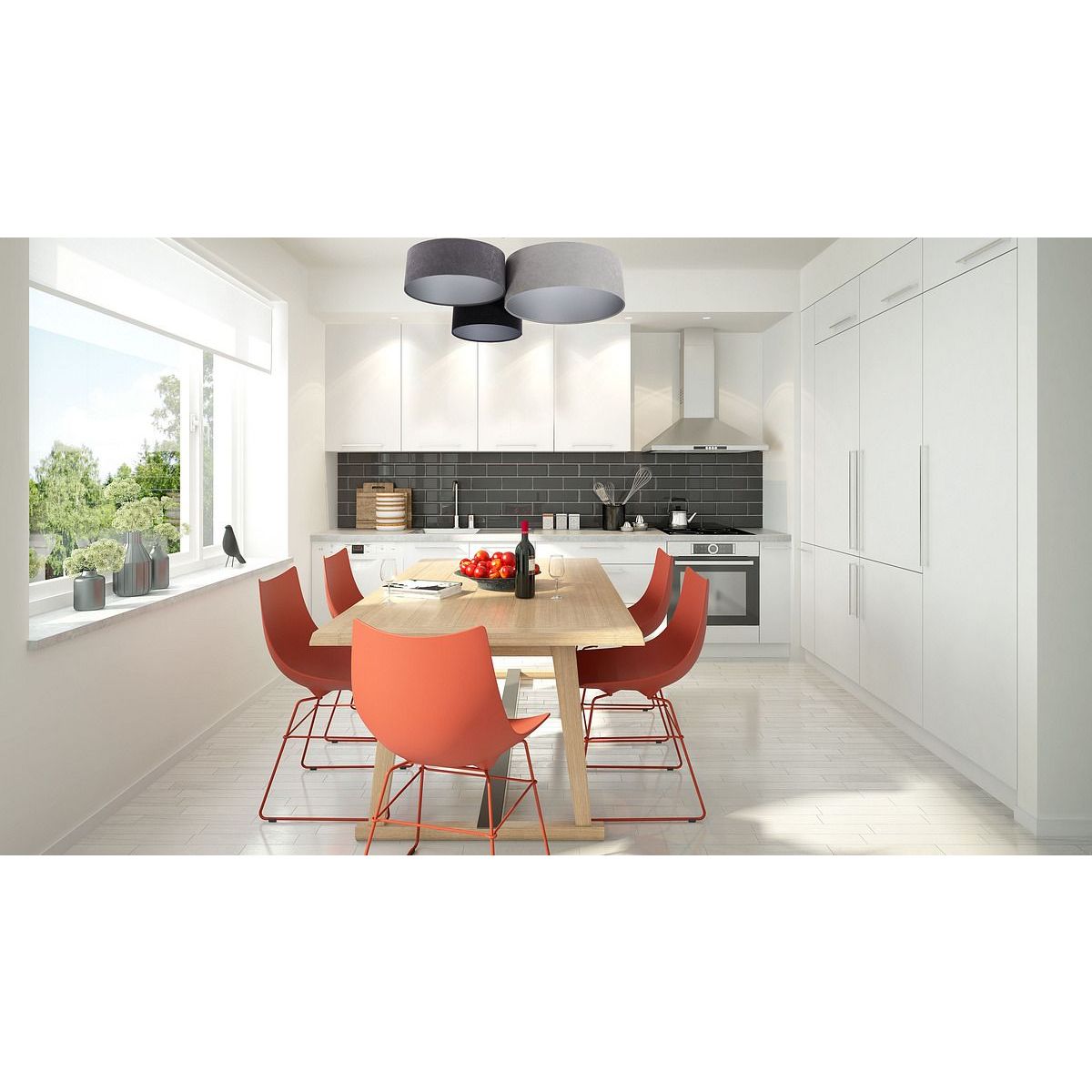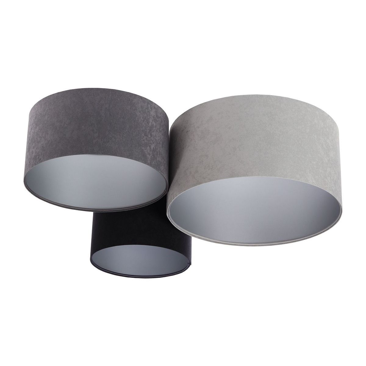 Lampenschirm aus PVC-Kunststoffgewebe mit silberner Innenseite. Außenmaße: 91 x 74 x 33 cm. Durchmesser der einzelnen Lampenschirme: 50 cm / 40 cm / 30 cm. Höhe der einzelnen Lampenschirme: 25 cm / 20 cm / 30 cm. Elektrische Parameter der Leuchte: 3 x E27 max. 60 W, 230 Volt. LED-Glühbirnen können verwendet werden.