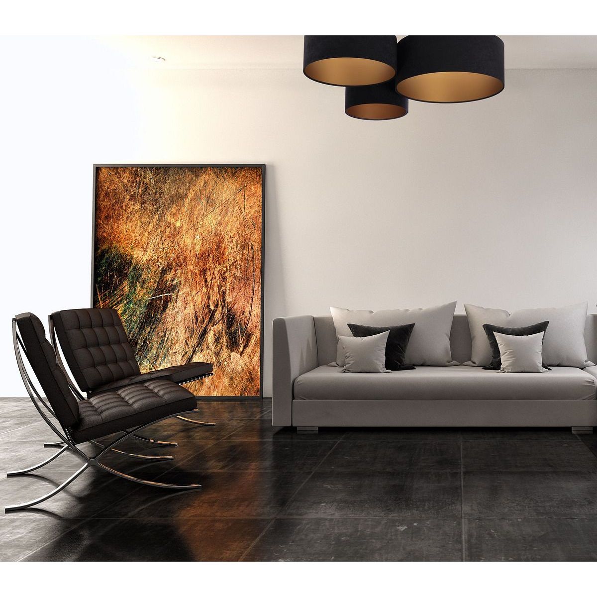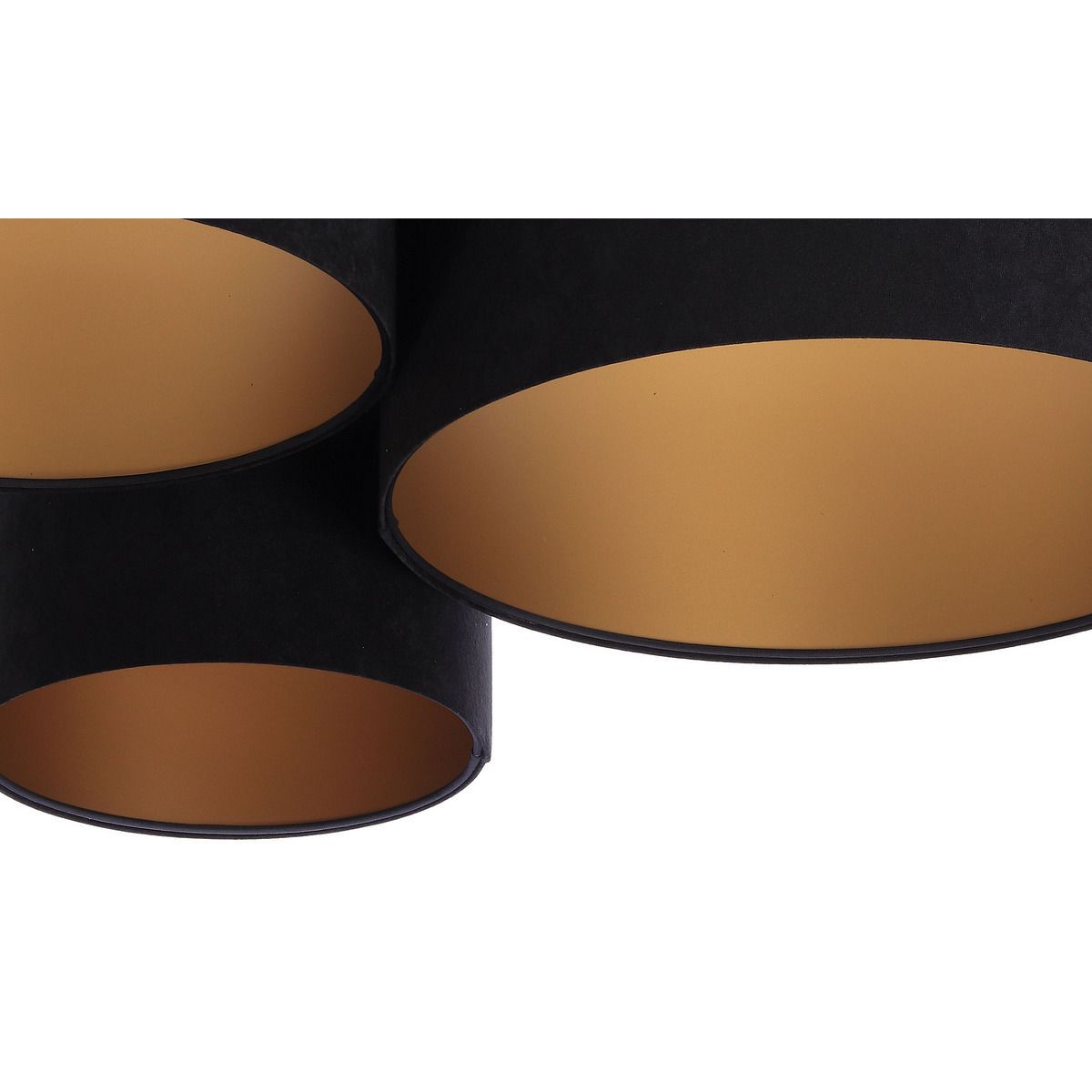 Lampenschirm aus PVC-Kunststoffgewebe mit goldener Innenseite. Außenmaße: 91 x 74 x 33 cm. Durchmesser der einzelnen Lampenschirme: 50 cm / 40 cm / 30 cm. Höhe der einzelnen Lampenschirme: 25 cm / 20 cm / 30 cm. Elektrische Parameter der Leuchte: 3 x E27 max. 60 W, 230 Volt. LED-Glühbirnen können verwendet werden.
