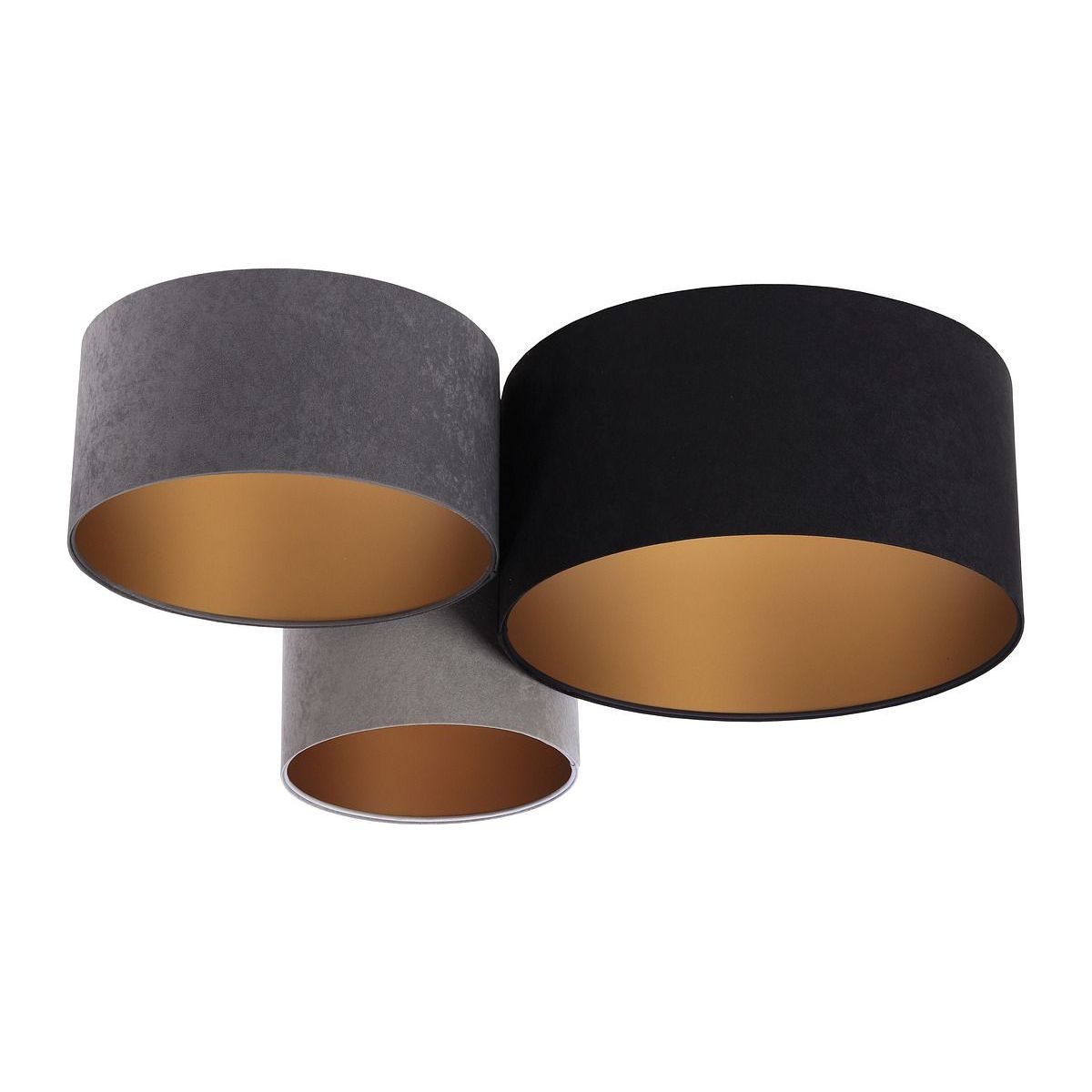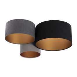 Lampenschirm aus PVC-Kunststoffgewebe mit goldener Innenseite. Außenmaße: 91 x 74 x 33 cm. Durchmesser der einzelnen Lampenschirme: 50 cm / 40 cm / 30 cm. Höhe der einzelnen Lampenschirme: 25 cm / 20 cm / 30 cm. Elektrische Parameter der Leuchte: 3 x E27 max. 60 W, 230 Volt. LED-Glühbirnen können verwendet werden.