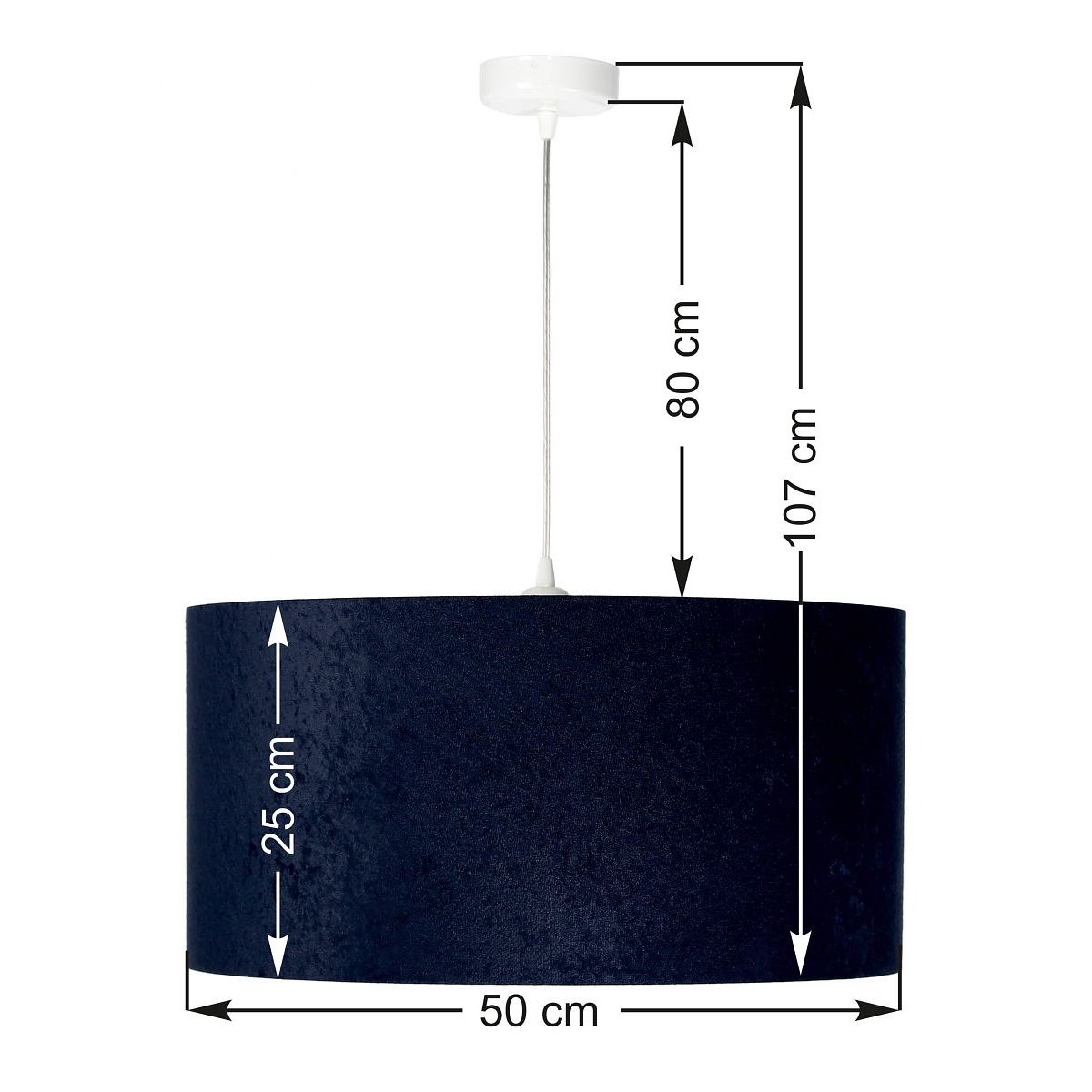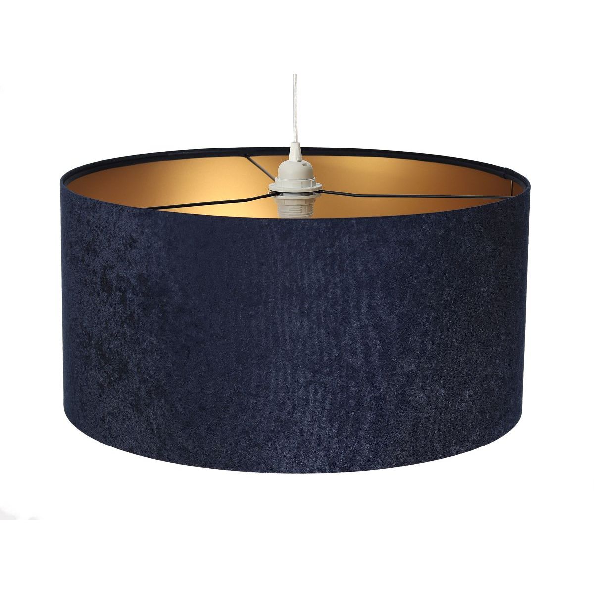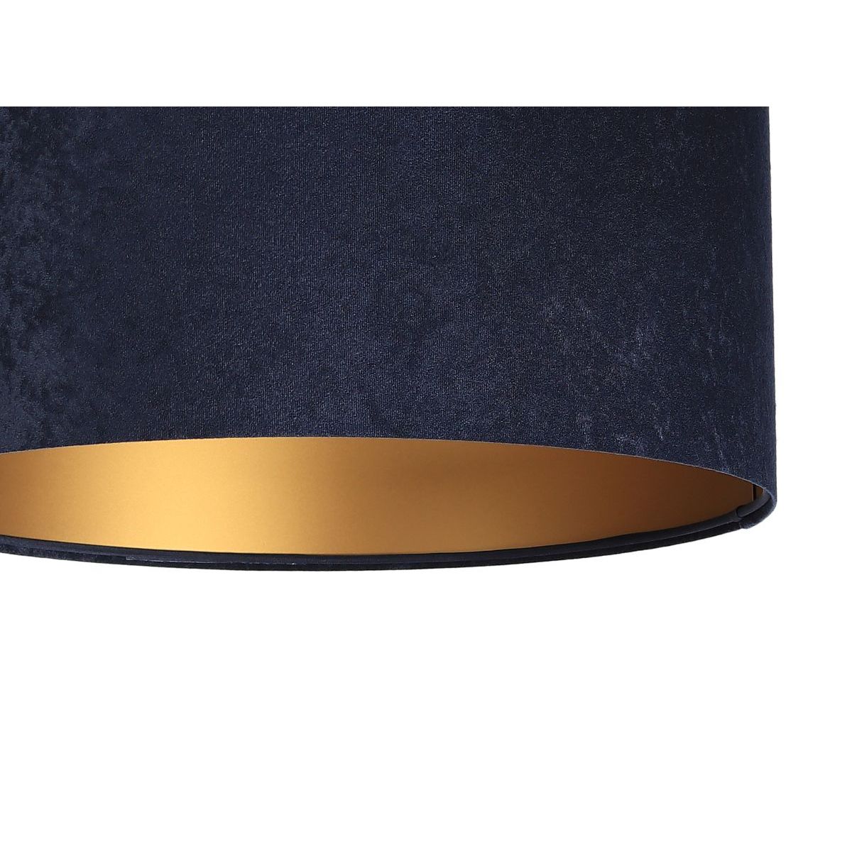 Lampenschirm aus dunkelblauem Stoff (Mikrofaser) auf PVC-Kunststoff mit mattgoldener Mitte. Fassungsparameter: 1 x E27 max. 60 W. Deckenrosettenparameter: Kunststoff, Maße 10 cm x 2 cm. Kabellänge: max. 80 cm, verstellbar. Farbe des Kabels: transparent. LED-Glühbirnen können verwendet werden.