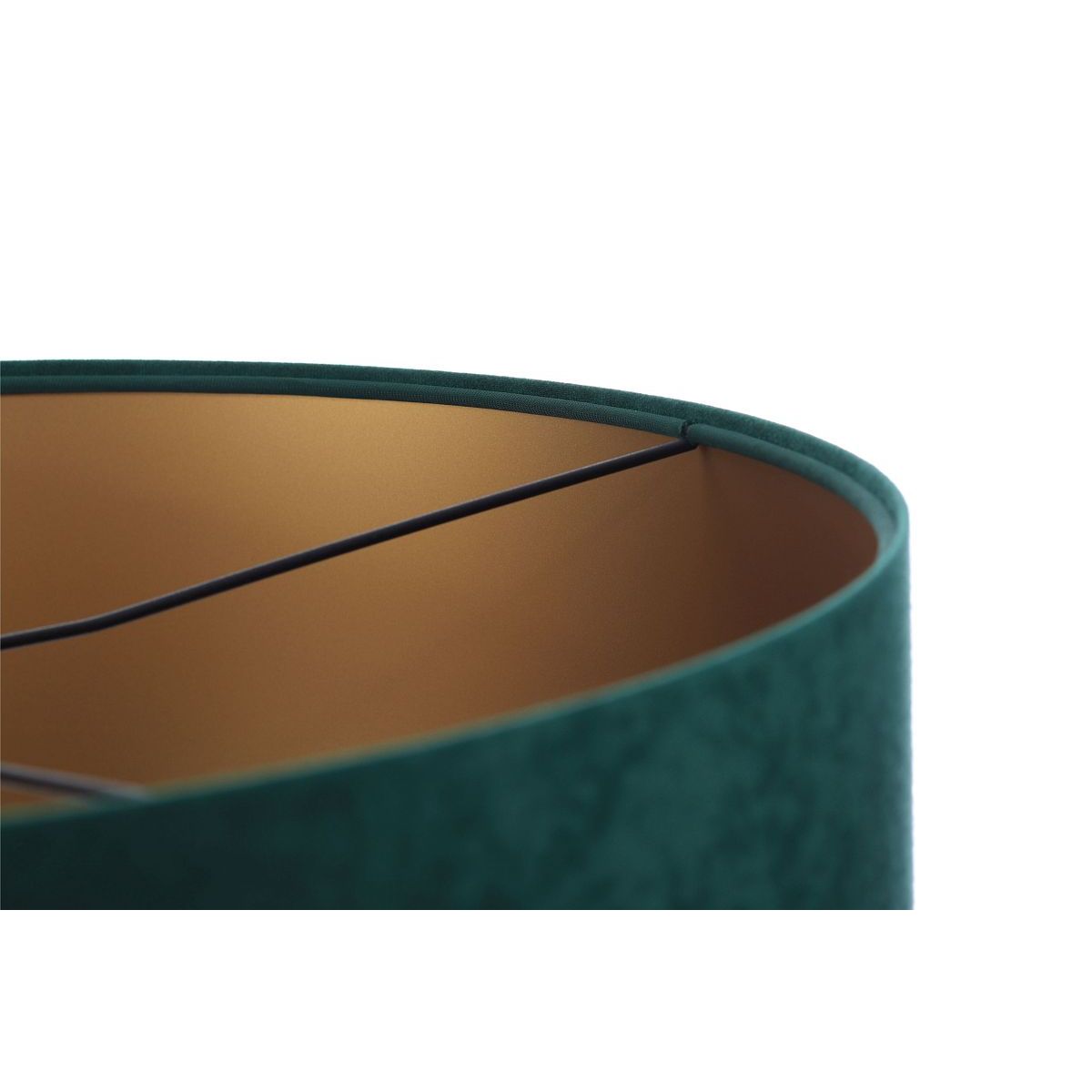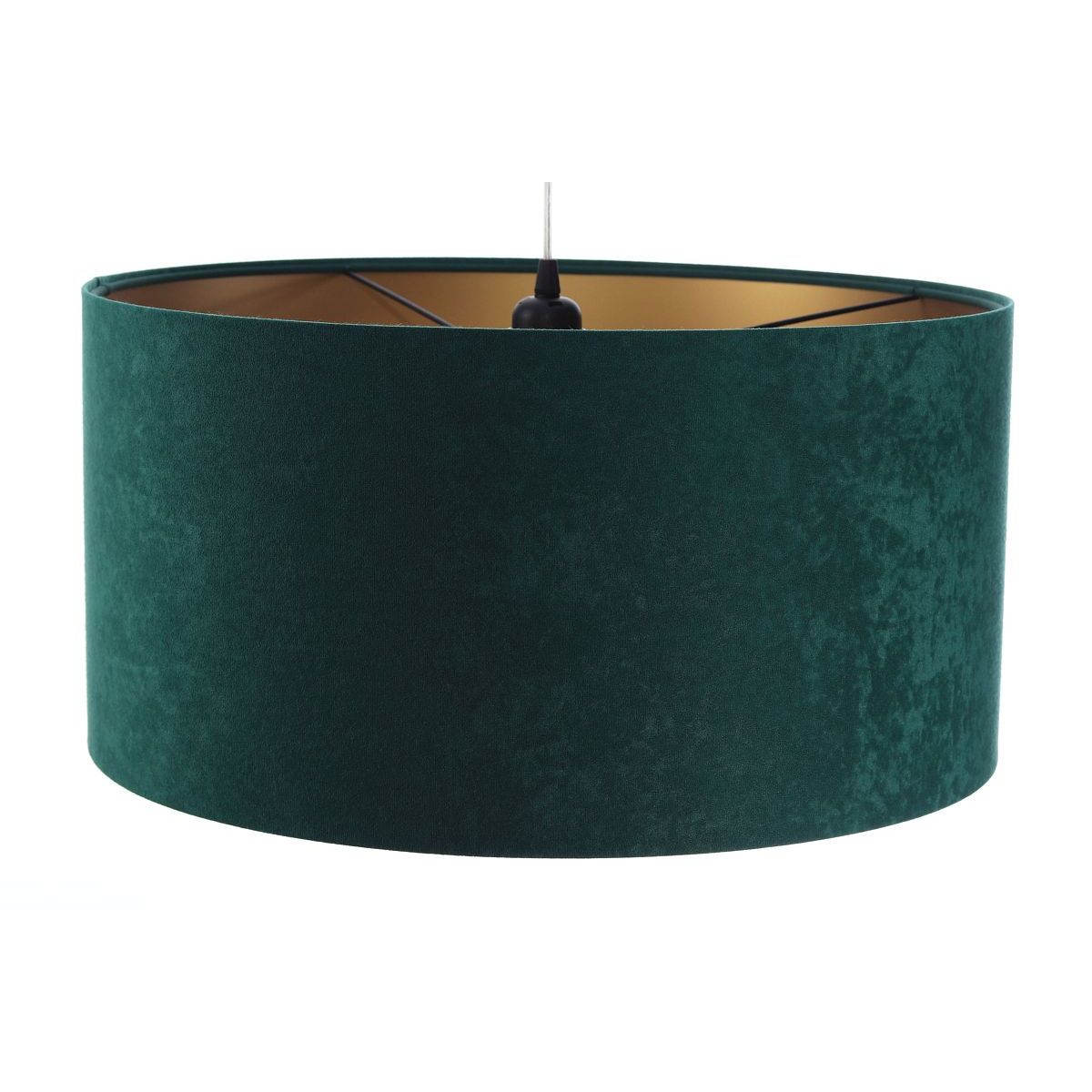 Lampenschirm aus dunkelgrünem Veloursstoff (Mikrofaser) auf PVC-Kunststoff mit mattgoldener Mitte. Parameter der Fassung: 1 x E27 max. 60 W. Parameter der Deckenrosette: Kunststoff, Abmessungen 10 cm x 2 cm. Kabellänge: max. 80 cm, verstellbar. Kabelfarbe: transparent. LED-Glühbirnen können verwendet werden.