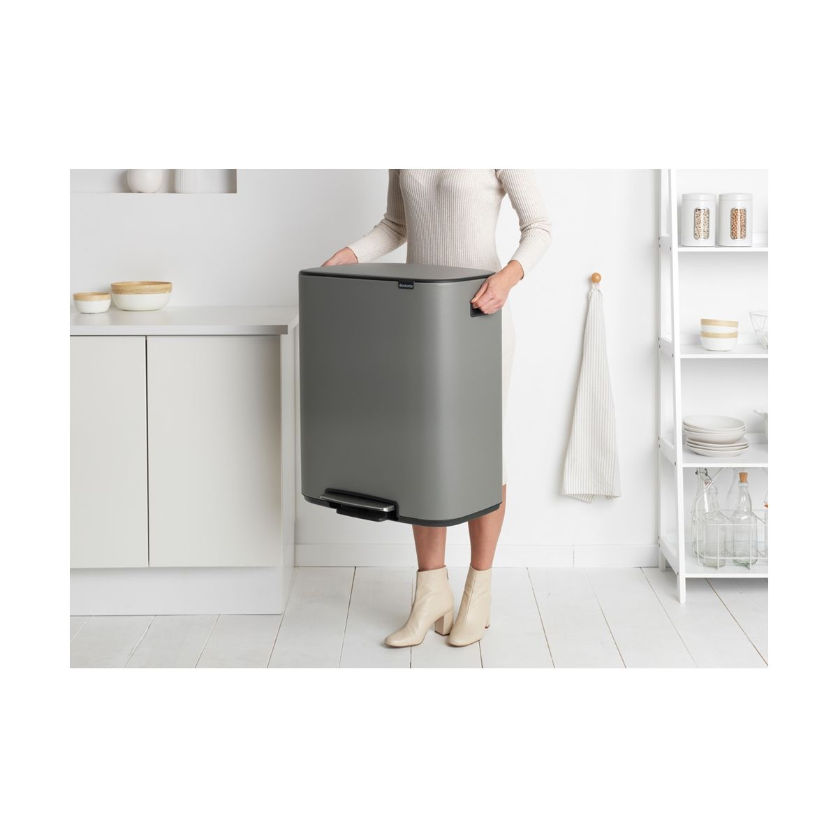 Suchen Sie nach einer schönen Lösung für den Abfall in Ihrem Zuhause? Der Treteimer Bo ist innen und außen schön. Er verfügt über zwei Innenbehälter für zwei Arten von Abfall. Er schmiegt sich gut an die Wand an, lässt sich leicht öffnen und sanft schließen. Ein großes Plus ist die 10-jährige Garantie.