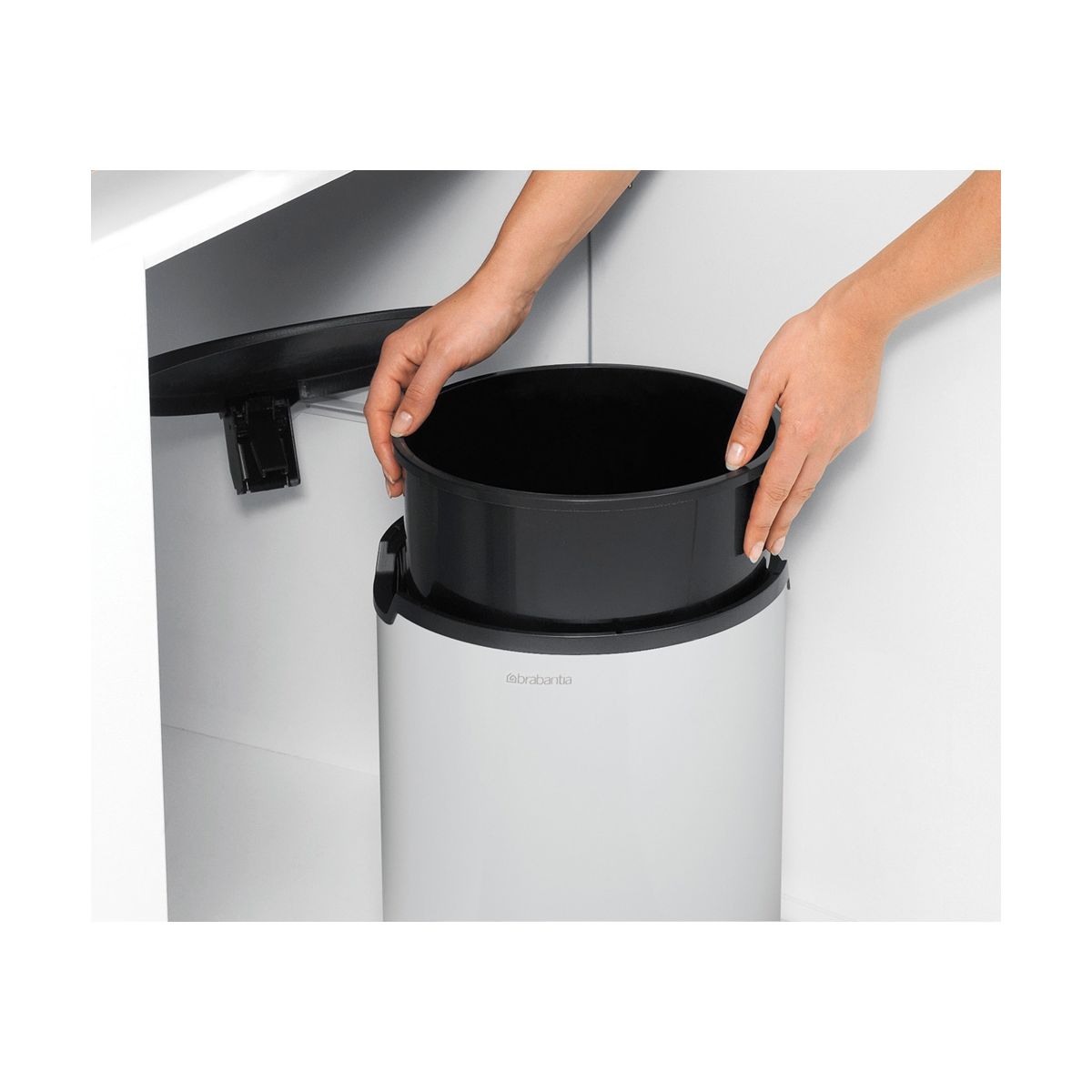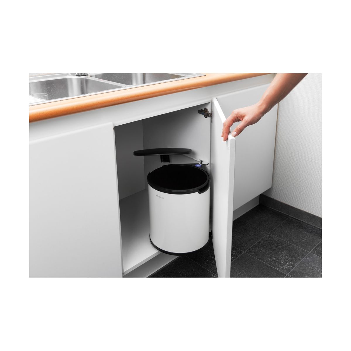 Was verbirgt sich im Schrank? Der praktische 15-Liter-Einbaubehälter von Brabantia bleibt in Ihrem Schrank versteckt, bis Sie die Tür öffnen. Sobald Sie dies tun, fährt er nach vorne und der Deckel öffnet sich automatisch. Die sehr große Öffnung bietet ausreichend Platz. Ein praktischer Einbaubehälter!