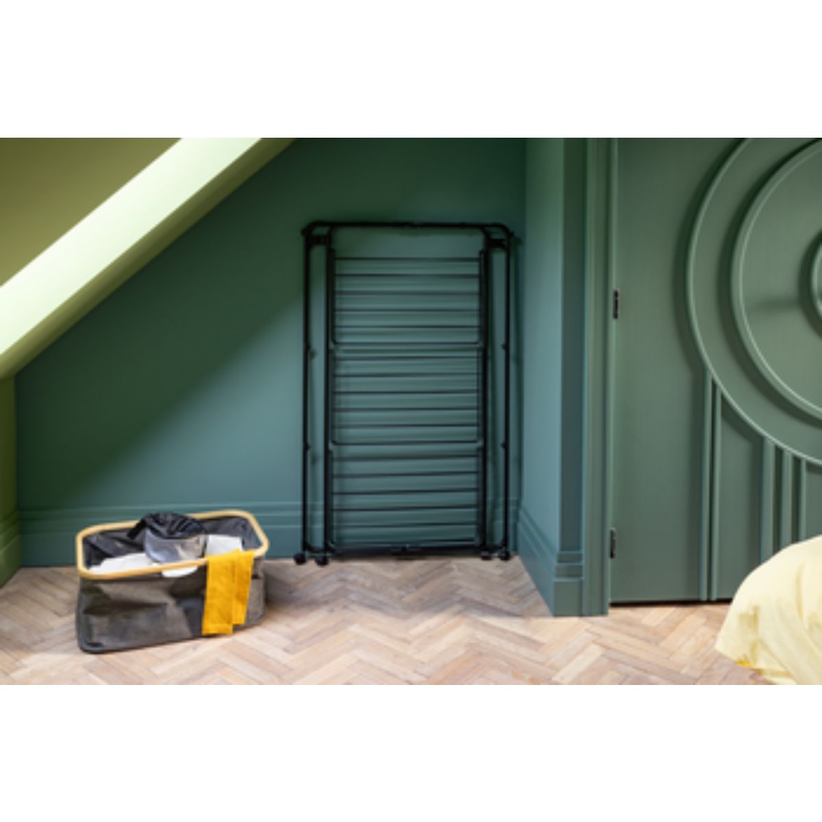 Sparen Sie Strom, indem Sie Ihre Wäsche auf natürliche Weise trocknen, und sparen Sie Platz, indem Sie sie auf dem HangOn Tower von Brabantia aufhängen! Mit 23 Metern flexibler Trockenfläche und zusätzlichen Haken und Halterungen für Kleiderbügel nimmt dieser intelligente Wäscheständer nur minimalen Platz auf dem Boden ein und spart so viel Platz. Der Wäscheständer verfügt über drei Trocknungsstufen, die bei Bedarf zusammengeklappt werden können, sodass er sich auch zum Trocknen langer Wäschestücke wie Handtücher eignet. Vier Rollen ermöglichen das Drehen und Bewegen. Nach dem Trocknen der Wäsche kann er flach zusammengeklappt werden, was eine kompakte Aufbewahrung ermöglicht. Transportverriegelungen halten den Rahmen an seinem Platz und dienen zusätzlich als Haken. Mit dem Kauf dieses Wäschetrockners unterstützen Sie auch die Organisation WeForest bei ihrer Mission, mehr Bäume zu pflanzen. Möchten Sie ihn nutzen?
