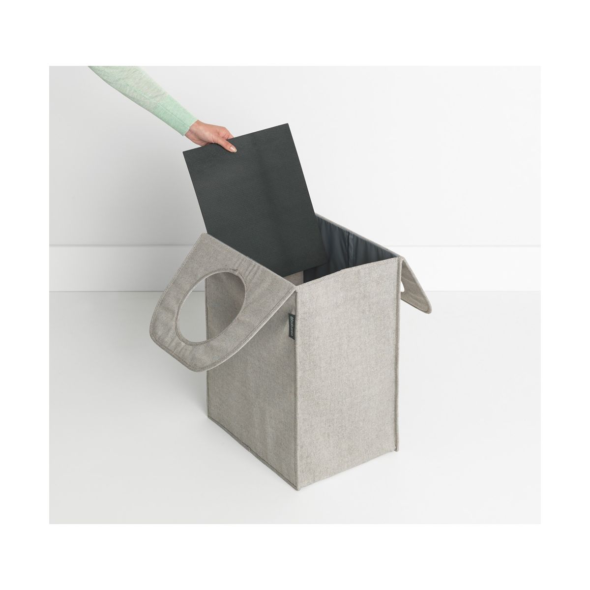 Große rechteckige Wäschetasche von Brabantia mit einem Fassungsvermögen von 55 Litern. Die strapazierfähige Textiltasche verfügt über einen Schnellverschluss, sodass Sie Ihre Wäsche direkt hineinwerfen und außer Sichtweite verstauen können.
