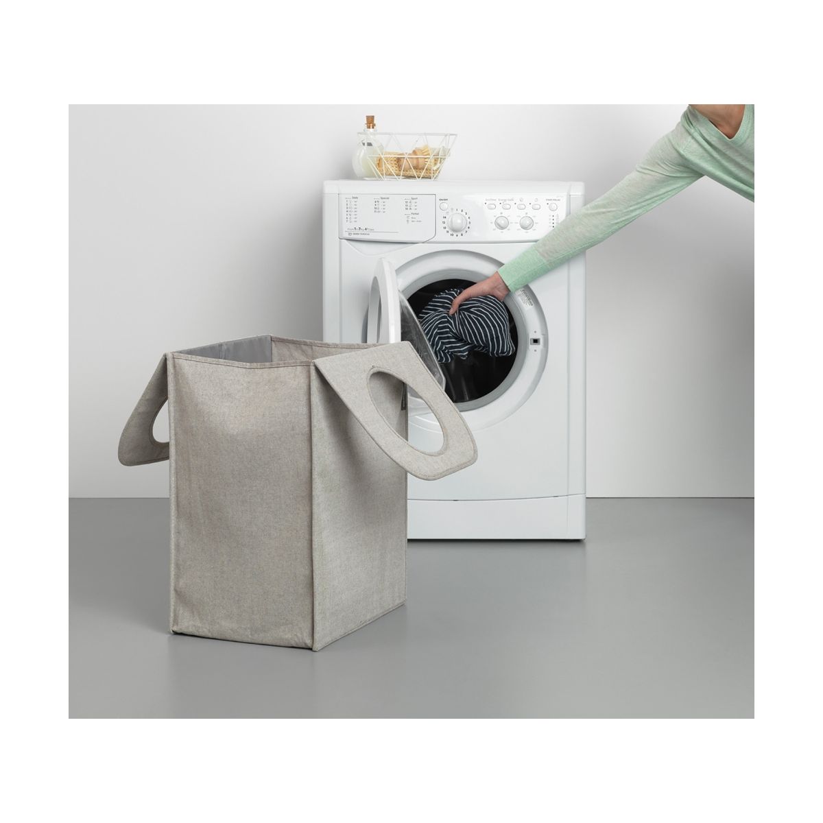 - Der obere Teil lässt sich zu Griffen ausklappen und erleichtert so den Transport der Wäsche zur Waschmaschine
