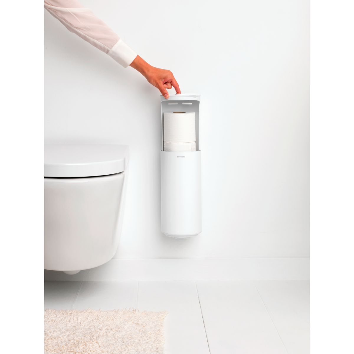 Mit diesem minimalistischen Toilettenpapierhalter MindSet von Brabantia sorgen Sie auch im kleinsten Raum Ihres Zuhauses für einen hohen Stilstandard. Bequeme Aufbewahrung von zwei Ersatzrollen Toilettenpapier. Sein geschlossener Korpus schützt die Rollen vor Staub und Spritzern – sehr hygienisch und sehr diskret. Ist es Zeit, die Rollen zu wechseln? Nehmen Sie eine Rolle mit dem praktischen Hebesystem heraus. Stil, Hygiene, Komfort.