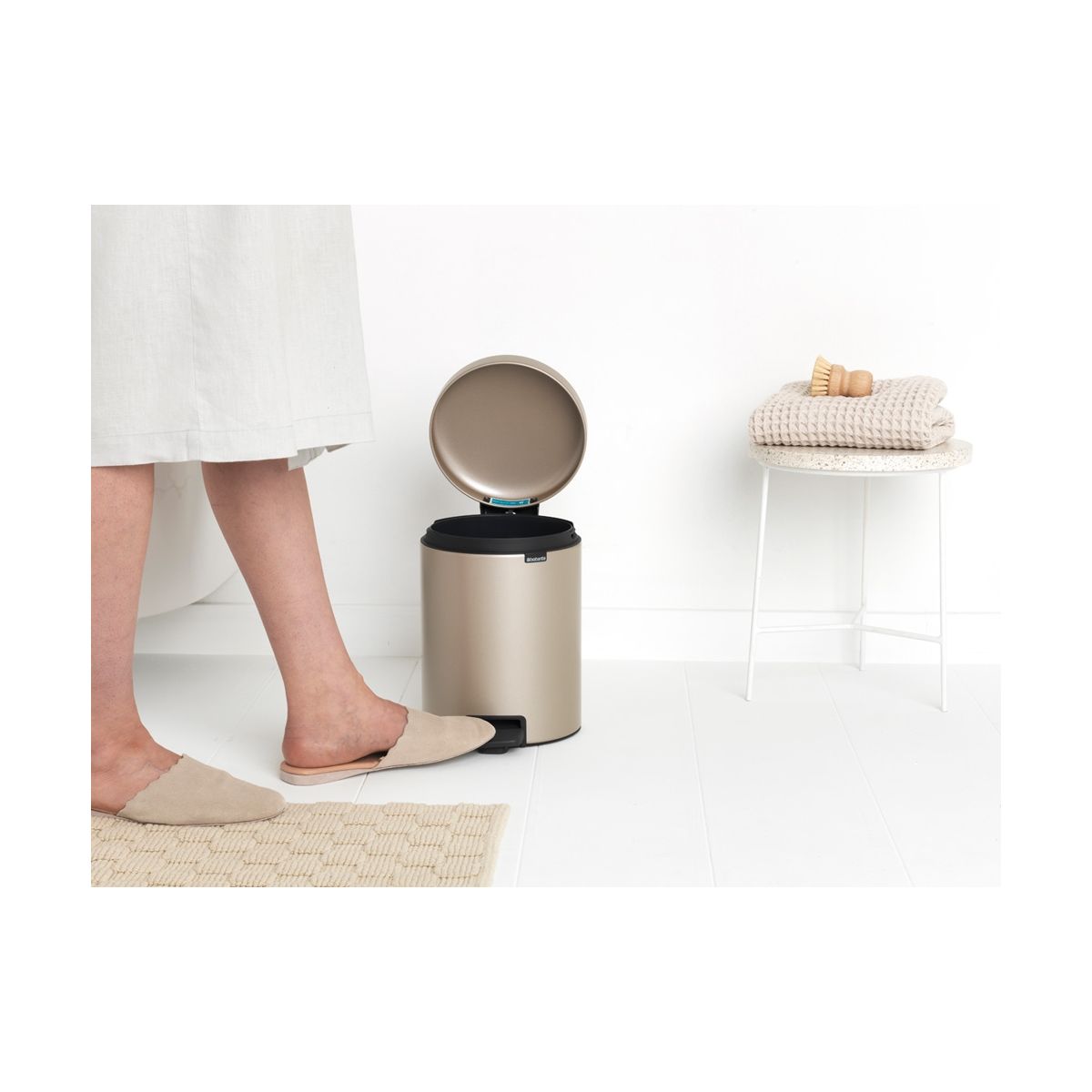 Der 5-Liter-Behälter NewIcon von Brabantia ist nicht nur stilvoll und hygienisch, sondern auch zuverlässig. Dank seines rutschfesten Bodens und seines Kippschutzes ist er robust und stabil. Der Deckel ist dicht und lässt sich mit einer leichten Berührung des Fußes sanft schließen und öffnen. Ideal für Badezimmer und Toiletten. Ein großes Plus ist die 10-jährige Garantie.