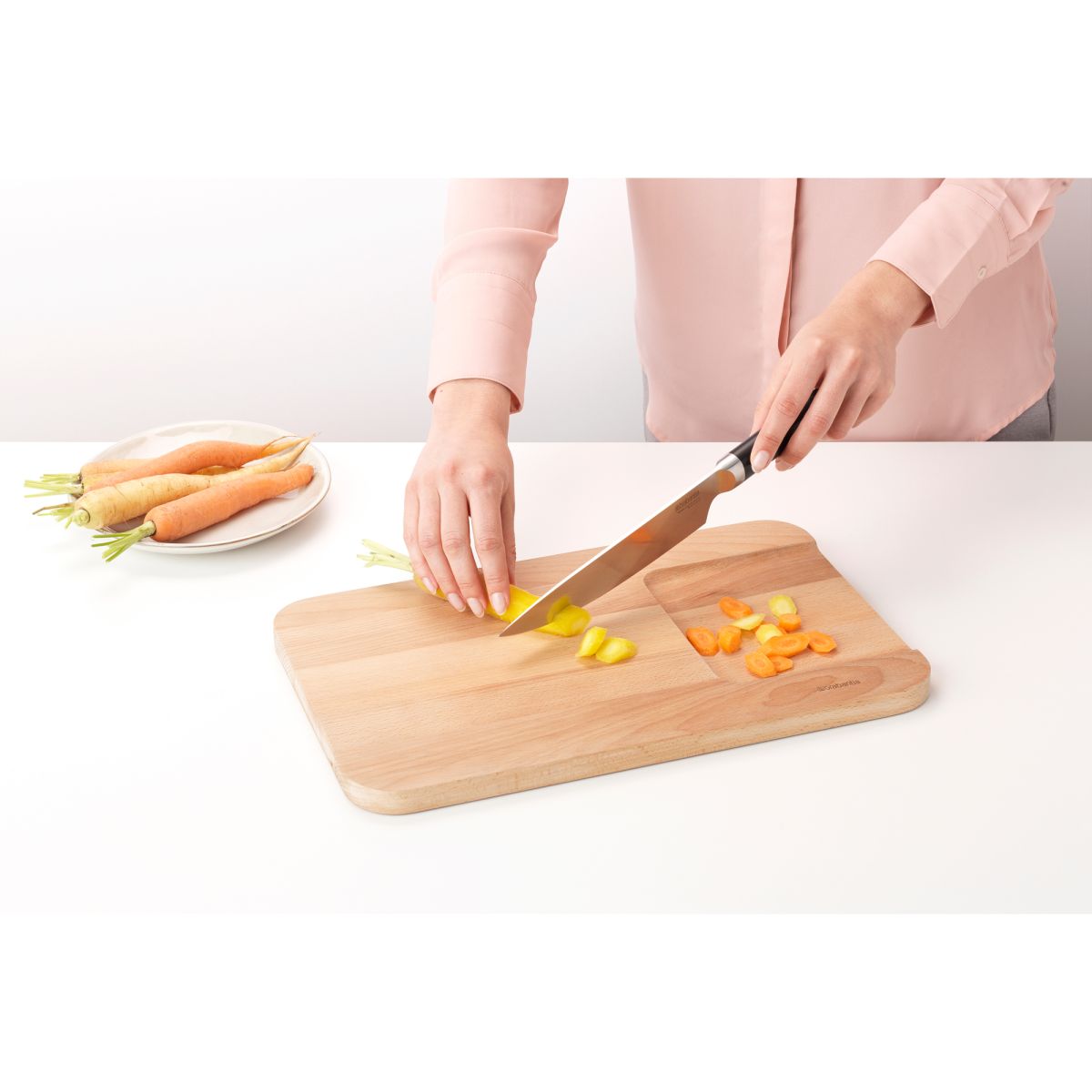 Mit dem ökologischen Holzbrett Profile von Brabantia wird das Schneiden und Hacken von Gemüse, Kräutern und Obst zu einem völlig neuen Erlebnis. Sie schneiden auf der oberen Seite und die Produkte fallen nach unten. Da dieser Teil schmaler ist, können Sie sie problemlos in die Pfanne geben. Alles geschnitten? Verwenden Sie die Rückseite des Bretts zum Servieren der Speisen. Hacken auf höchstem Niveau!