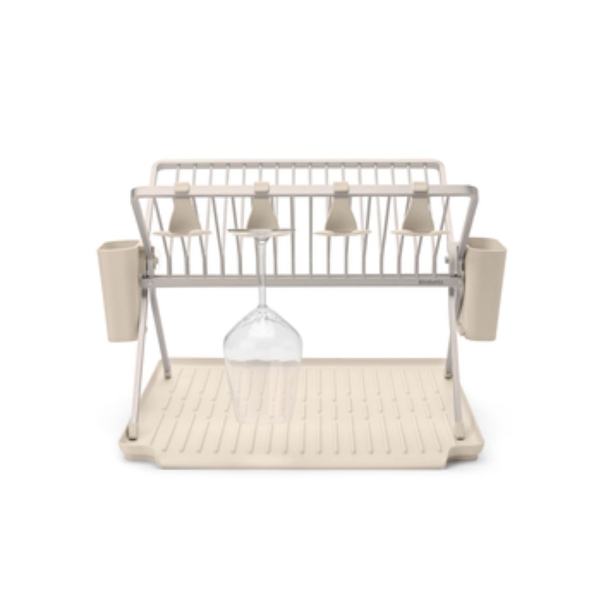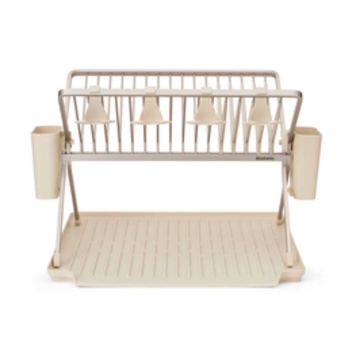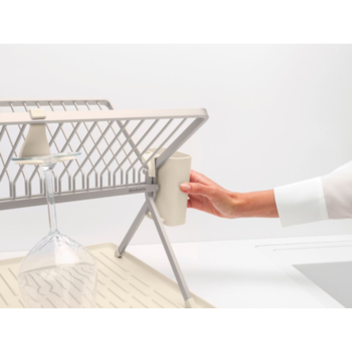 Das Geschirr wäscht sich zwar nicht von selbst – aber es trocknet ganz von selbst! Stellen Sie es einfach auf den zusammenklappbaren Geschirrtrockner SinkSide von Brabantia mit Abtropfschale. Er bietet Platz für bis zu 17 Teller. Außerdem gibt es Platz zum Aufhängen von 4 Weingläsern. Die Besteckkörbe sind abnehmbar, was das Zusammenklappen und Verstauen des Geschirrtrockners erleichtert. Die Auffangschale verhindert, dass die Arbeitsplatte nass wird, und das Wasser fließt von dort direkt in die Spüle – ein unvergleichlicher Geschirrtrockner.