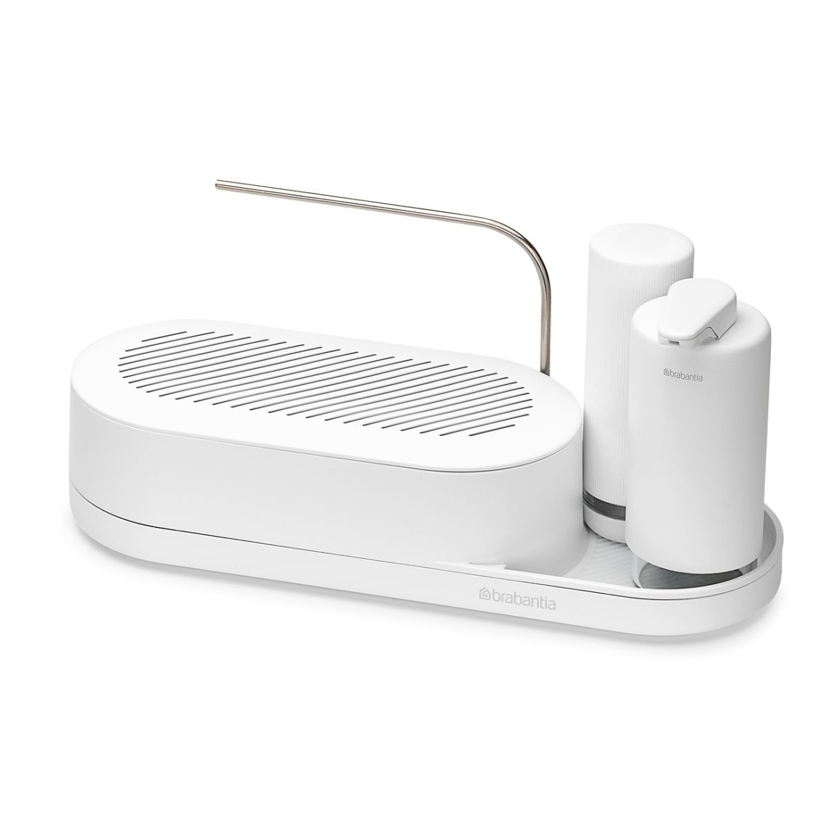 Nutzen Sie das Geschirrspülzubehör-Set von Brabantia. Damit halten Sie die Arbeitsflächen rund um die Spüle ganz einfach in Ordnung. Lassen Sie sich nicht von seiner Form täuschen. Im Inneren des Behälters finden Sie genügend Platz für einen Schwamm, einen Scheuerschwamm, eine Spülbürste und viele andere Accessoires. Das Innengitter sorgt für die Belüftung des Behälters und verhindert muffige Gerüche. Sie können den Organizer und zwei Spender nebeneinander auf einem rutschfesten Tablett platzieren. Alles griffbereit!
