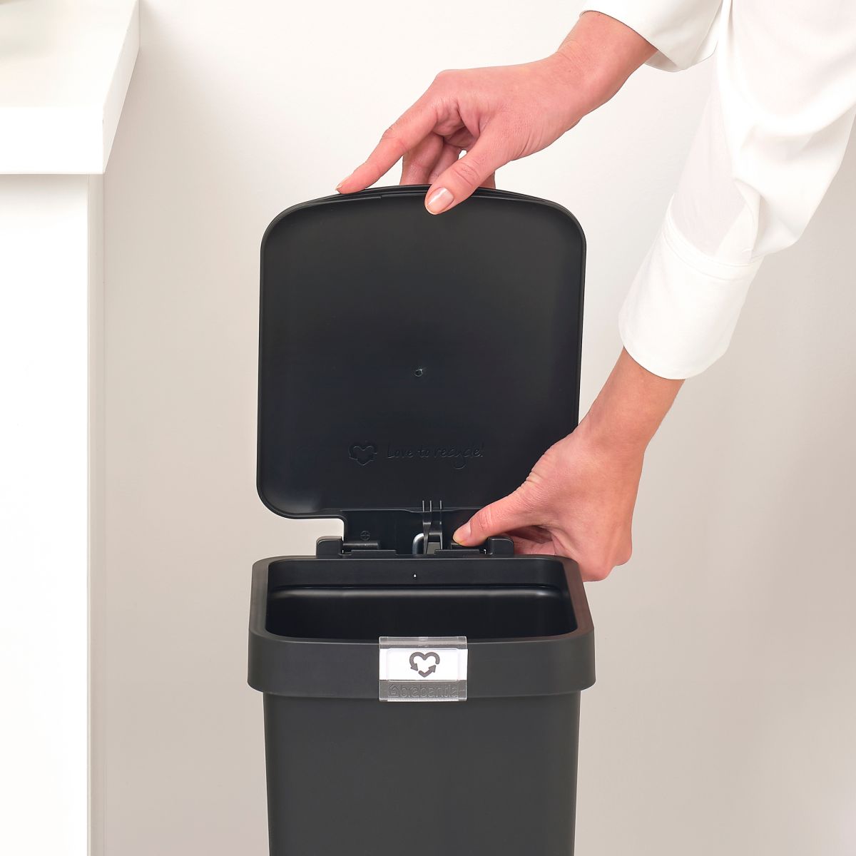 - Kein sichtbarer Beutel – der Rand verdeckt Brabantia PerfectFit-Beutel (Code C) vollständig. Leicht zu transportieren – Griff im Deckelscharnier.