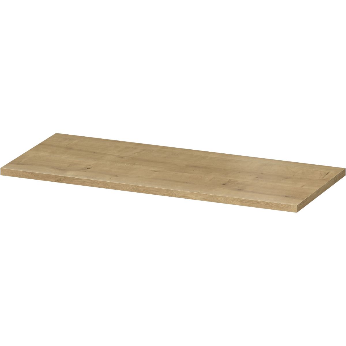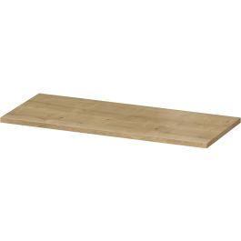 Eine Arbeitsplatte zur Kombination mit Unterbaumöbeln, auf der ein Waschbecken montiert oder kleine Gegenstände und Kosmetika abgestellt werden können. Die Arbeitsplatte besteht aus laminierter Spanplatte in Eichefarbe.