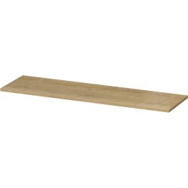 Eine Arbeitsplatte zur Kombination mit Unterbaumöbeln, auf der ein Waschbecken montiert oder kleine Gegenstände und Kosmetika abgestellt werden können. Die Arbeitsplatte besteht aus laminierter Spanplatte in Eichefarbe.