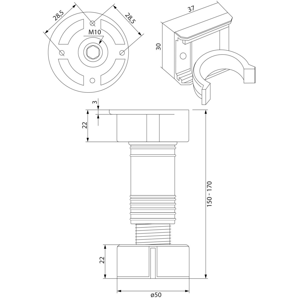 Schwarze technische Füße zur Montage mit CITY-Schränken von Cersanit, zusammen mit einem Möbelsockel. Die Füße sind höhenverstellbar, was eine genaue Nivellierung ermöglicht.
