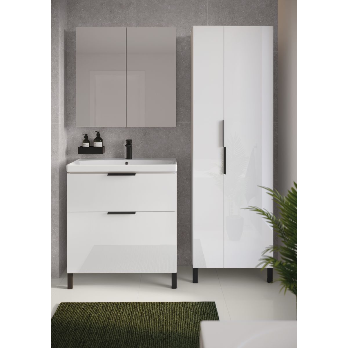 Hängeschrank mit Spiegelfront und 3 Einlegeböden im Inneren, der als Spiegel und Stauraum für kleine Kosmetikartikel dient. Der Schrank verfügt über ein griffloses Türöffnungssystem und eine leise Soft-Close-Funktion. Der Korpus des Schranks besteht aus laminierter Spanplatte.