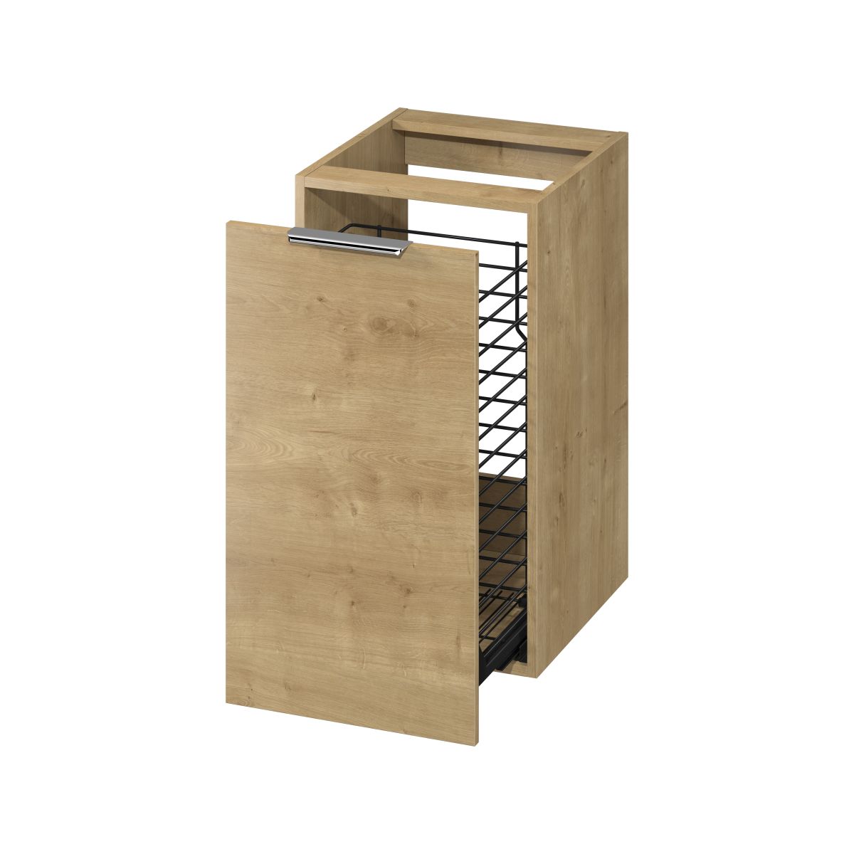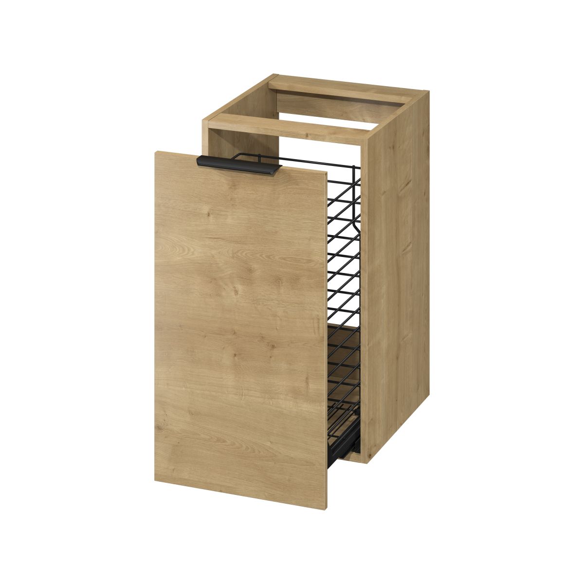 Der Schrank mit Korb ist ein ästhetischer Aufbewahrungsort für Wäsche, der Ihnen hilft, Ordnung in Ihre Kleidung zu bringen. Der Metallkorb hat 1 Fach. Der Korpus und die Vorderseite des Schranks sind aus Spanplatten gefertigt. Es besteht die Möglichkeit, separat Griffe in Schwarz und Silber sowie dekorative Füße in derselben Farbe wie die Griffe zu erwerben.