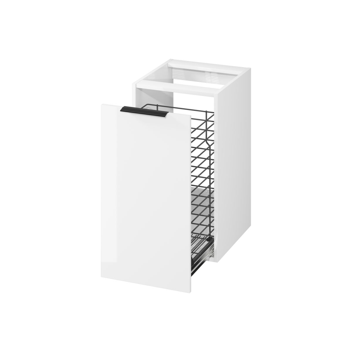 Der Schrank mit Korb ist ein ästhetischer Aufbewahrungsort für Wäsche, der Ihnen hilft, Ordnung in Ihre Kleidung zu bringen. Der Metallkorb hat 1 Fach. Der Korpus und die Vorderseite des Schranks sind aus Spanplatten gefertigt. Es besteht die Möglichkeit, separat Griffe in Schwarz und Silber sowie dekorative Füße in derselben Farbe wie die Griffe zu erwerben.