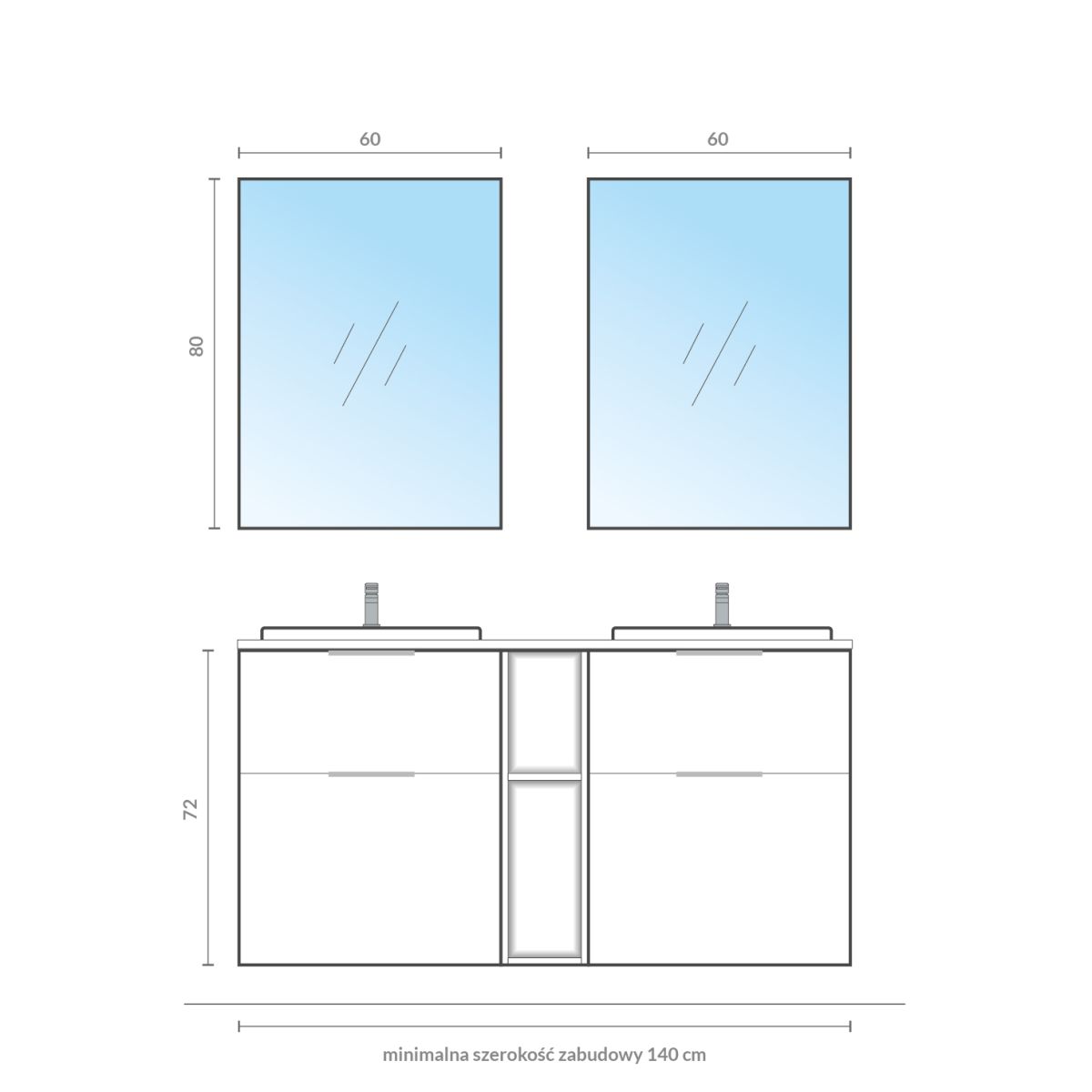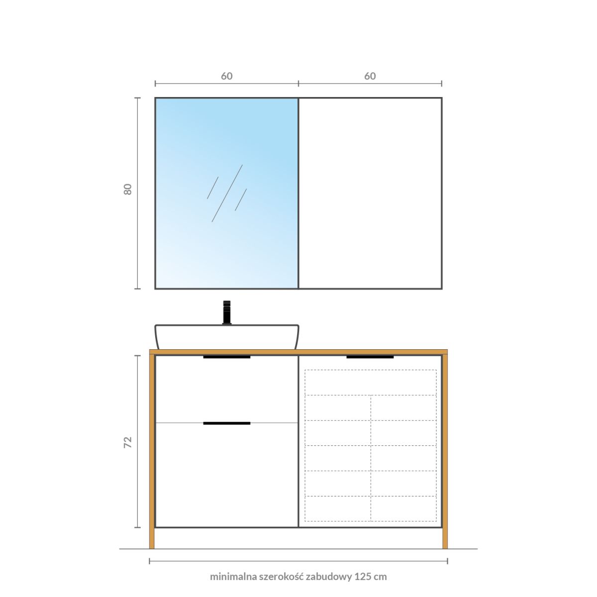 Hängeschrank mit Spiegelfront und 3 Einlegeböden im Inneren, der als Spiegel und Aufbewahrungsort für kleine Kosmetikartikel dient. Der Schrank verfügt über ein griffloses Türöffnungssystem und eine leise Soft-Close-Funktion. Der Korpus des Schranks besteht aus laminierter Spanplatte.