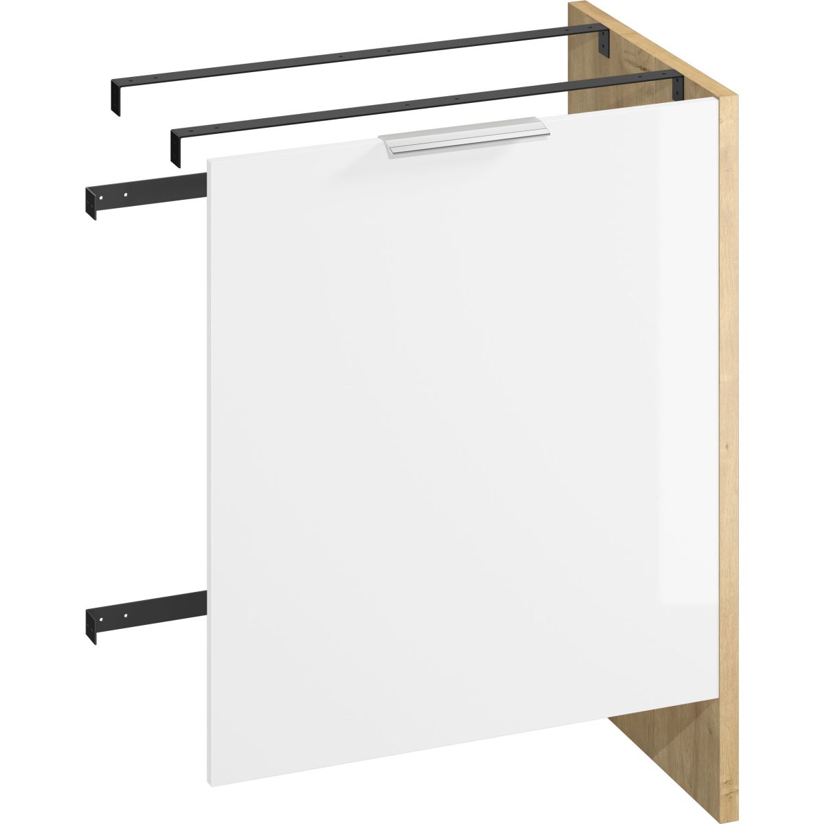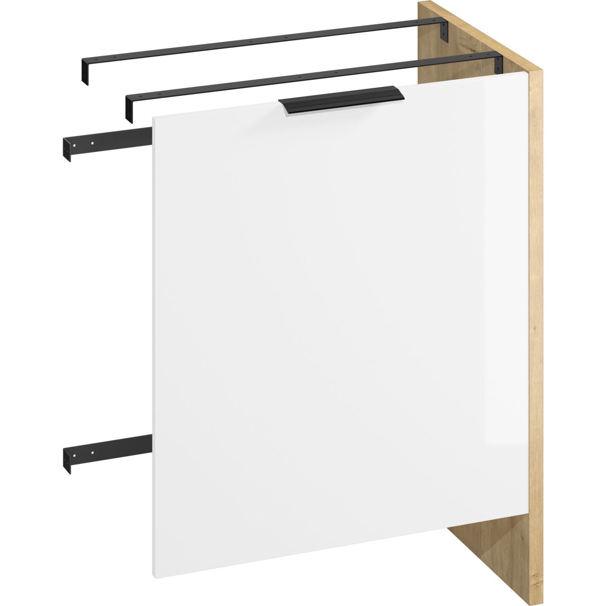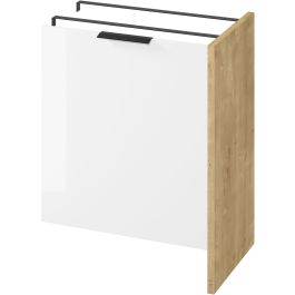 Der Einbauschrank für Waschmaschinen mit Türen fügt sich perfekt in die allgemeine Inneneinrichtung ein und verbirgt die Haushaltsgeräte ästhetisch hinter den Schranktüren. Der Schrank besteht aus Spanplatten, mit einer Seite in natürlicher Eiche und einer Front in Weiß. Es besteht die Möglichkeit, Griffe in Schwarz oder Silber hinzuzukaufen.