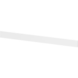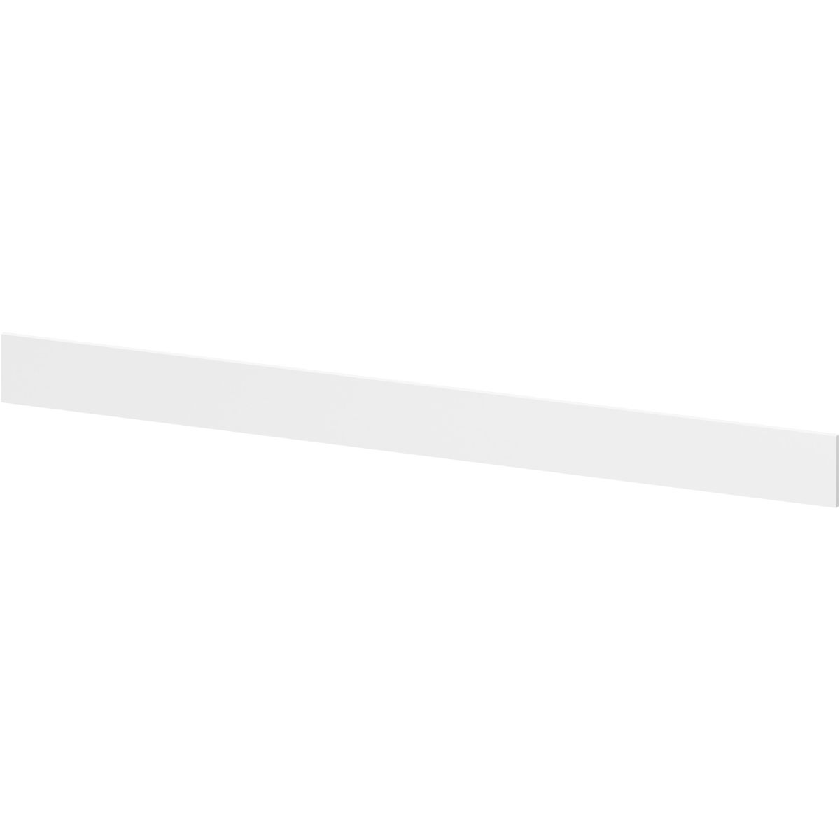 Möbelsockel aus weißer Spanplatte. Im Set enthalten ist eine Abdeckleiste, um den gekürzten Teil des Sockels zu verdecken.
