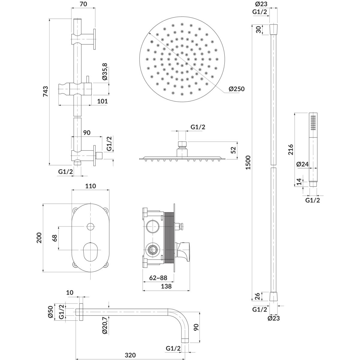 Lieferumfang: Batterie mit Schalter, Duschkopf, Duschkopf, Duschschlauch, Duschstange, Duscharm