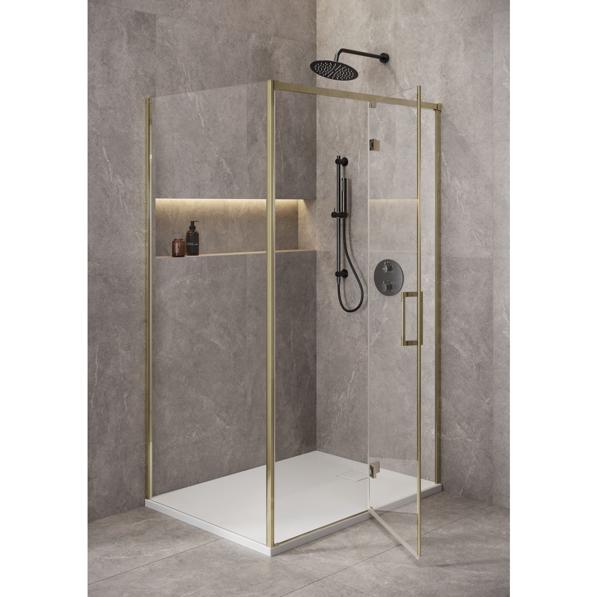 Die begehbare Duschkabine besteht aus 6 mm starkem Sicherheitsglas, das für Stabilität sorgt und die Sicherheit bei der Benutzung garantiert. Das Glas ist mit einer wasserabweisenden CleanPro-Beschichtung versehen, die wirksam Kalkablagerungen und Verschmutzungen verhindert und so die Reinigung der Kabine erleichtert. Die Kabine ist mit einem funktionalen Wandprofil ausgestattet, das sich an Unebenheiten der Wand anpasst. Die Standardlänge der Wandhalterung beträgt 120 cm, kann jedoch je nach gewünschter Breite des Kabineneingangs gekürzt werden. Ein dezenter Metallrahmen um das Glas rundet das elegante Gesamtbild ab, während goldene Details dem Innenraum einen Hauch von Luxus verleihen. Höhe 200 cm. Transparentes Glas. Profile in mattem Gold. Die Kabine kann links- oder rechtsseitig montiert werden. Die hohe Qualität des Produkts wird durch eine langjährige Garantie bestätigt. Passend zur Kabine ist eine große Auswahl an Duschrinnen und Duschwannen in verschiedenen Farben und Höhen erhältlich, was eine flexible Konfiguration ermöglicht.