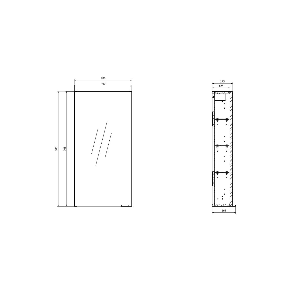 Der Spiegelschrank in der Größe 40 besteht aus anthrazitfarben lackierter Spanplatte mit mattem Finish auf der Vorderseite des Spiegels. Das Innere des Schranks wurde mit Blick auf Benutzerfreundlichkeit entworfen. Es gibt drei Glasablagen, die viel Stauraum bieten und dabei helfen, Ordnung im Badezimmer zu halten. Der praktische silberne Griff, der sich subtil in das minimalistische Design einfügt, erleichtert das Öffnen, und der Soft-Close-Mechanismus sorgt für ein leises und sanftes Schließen der Türen und erhöht so den Bedienkomfort. Die Spanplatte, aus der der Schrank gefertigt ist, verfügt über das Zertifikat FSC MIX CREDIT SGSCH-COC-007574.