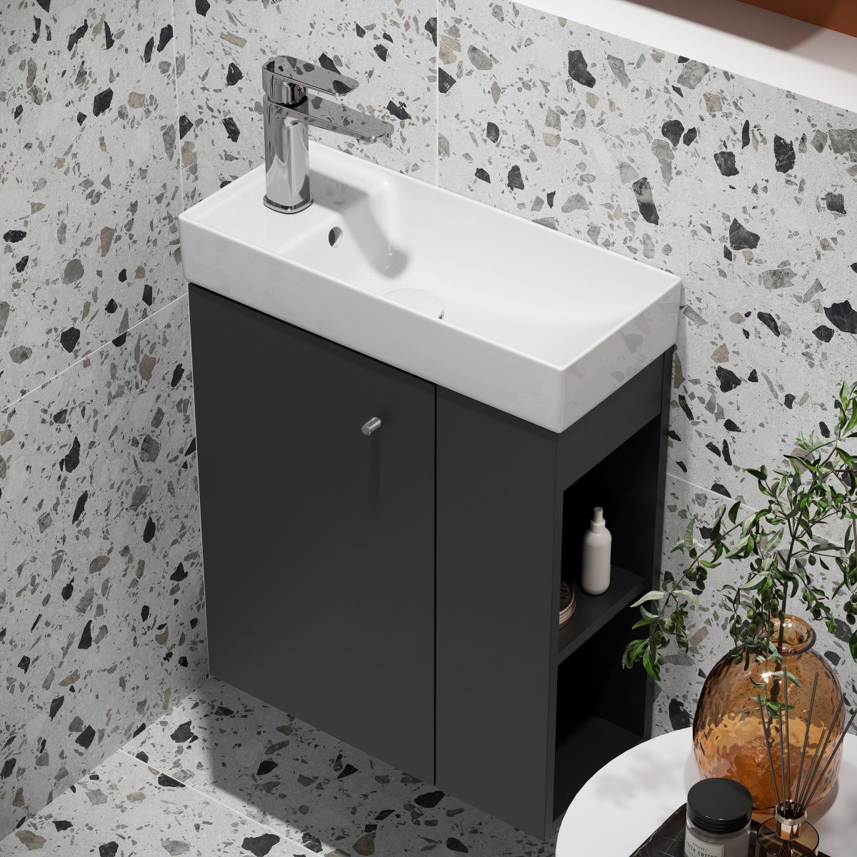 Der Waschtischunterschrank aus der Larga-Kollektion ist die perfekte Lösung für kleine Badezimmer und verbindet Stil und Funktionalität. Mit seinen kompakten Abmessungen von 50 cm Breite und 22 cm Tiefe passt er selbst in sehr begrenzte Räume. Die Front und der Korpus bestehen aus Spanplatten, die mit einem eleganten anthrazitfarbenen Lack überzogen sind, der den minimalistischen und zeitlosen Charakter des Möbelstücks unterstreicht. Der Schrank verfügt über ein Regal im Inneren, das aus Möbelplatten gefertigt ist. Der Schrank ist mit einem praktischen gefrästen Möbelknauf ausgestattet, der in drei Farbvarianten erhältlich ist: Silber, Gold und Schwarz – der Knauf kann separat erworben werden, um das Aussehen des Möbels an individuelle Vorlieben anzupassen. Das Soft-Close-System sorgt dafür, dass sich die Türen sanft und geräuschlos schließen, was den Bedienkomfort erhöht. Zur Selbstmontage.