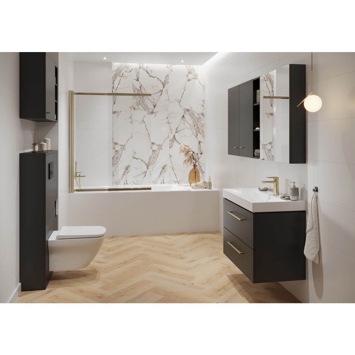 Waschbeckenunterschrank aus der Larga-Kollektion in Anthrazit in der Größe 50. Die Front und der Korpus bestehen aus Spanplatten, die mit einem eleganten anthrazitfarbenen Lack überzogen sind. Der Schrank verfügt über zwei geräumige Schubladen, die viel Platz für die Aufbewahrung von Kosmetika, Handtüchern und Badaccessoires bieten. Ihr Inneres ist in einem eleganten Grau gehalten, das mit der anthrazitfarbenen Front harmoniert und ein ästhetisch einheitliches Ganzes bildet. Das Soft-Close-System sorgt dafür, dass die Schubladen sanft und geräuschlos schließen, was den Bedienkomfort erhöht. Ein charakteristisches Element des Schranks ist der gefräste Griff, der seinen minimalistischen Stil unterstreicht. Dieser Griff ist in drei Farben erhältlich – Silber, Gold und Schwarz –, wodurch das Möbelstück individuell gestaltet und an andere Badezimmerausstattungselemente angepasst werden kann. Der Griff muss separat erworben werden. Die Platte, aus der der Schrank gefertigt ist, verfügt über das Zertifikat FSC MIX CREDIT SGSCH-COC-007574.