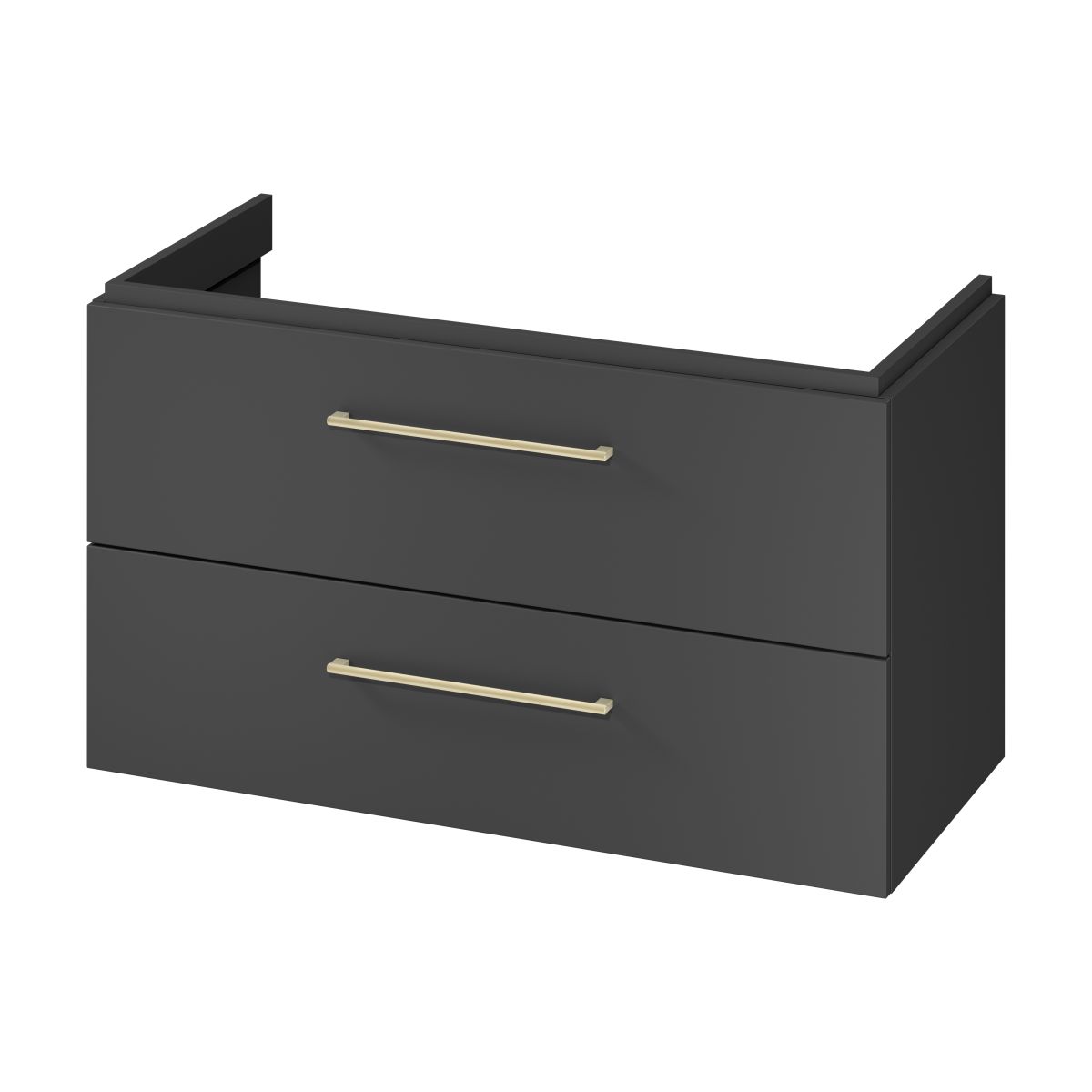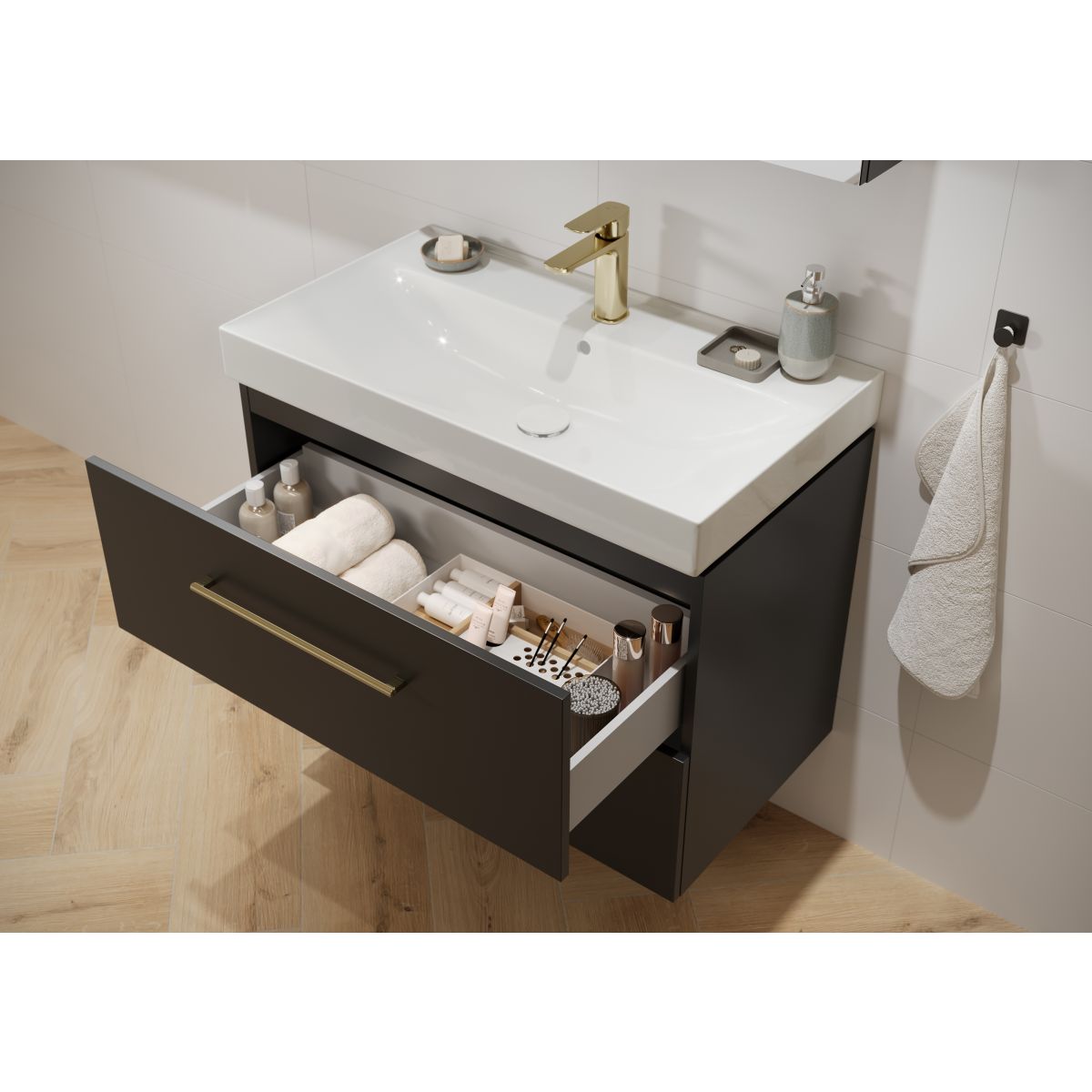 Waschbeckenunterschrank aus der Larga-Kollektion in Anthrazit in der Größe 100. Die Front und der Korpus bestehen aus hochwertiger Spanplatte, die mit einem eleganten anthrazitfarbenen Lack überzogen ist. Der Schrank verfügt über zwei geräumige Schubladen, die viel Platz für die Aufbewahrung von Kosmetika, Handtüchern und Badaccessoires bieten. Ihr Inneres ist in einem eleganten Grau gehalten, das mit der anthrazitfarbenen Front harmoniert und ein ästhetisch einheitliches Gesamtbild ergibt. Das Soft-Close-System sorgt dafür, dass die Schubladen sanft und geräuschlos schließen, was den Bedienkomfort erhöht. Ein charakteristisches Element des Schranks ist der gefräste Griff, der seinen minimalistischen Stil unterstreicht. Dieser Griff ist in drei Farben erhältlich – Silber, Gold und Schwarz –, wodurch das Möbelstück individuell gestaltet und an andere Badezimmerausstattungselemente angepasst werden kann. Der Griff muss separat erworben werden. Die Platte, aus der der Schrank gefertigt ist, verfügt über das Zertifikat FSC MIX CREDIT SGSCH-COC-007574.