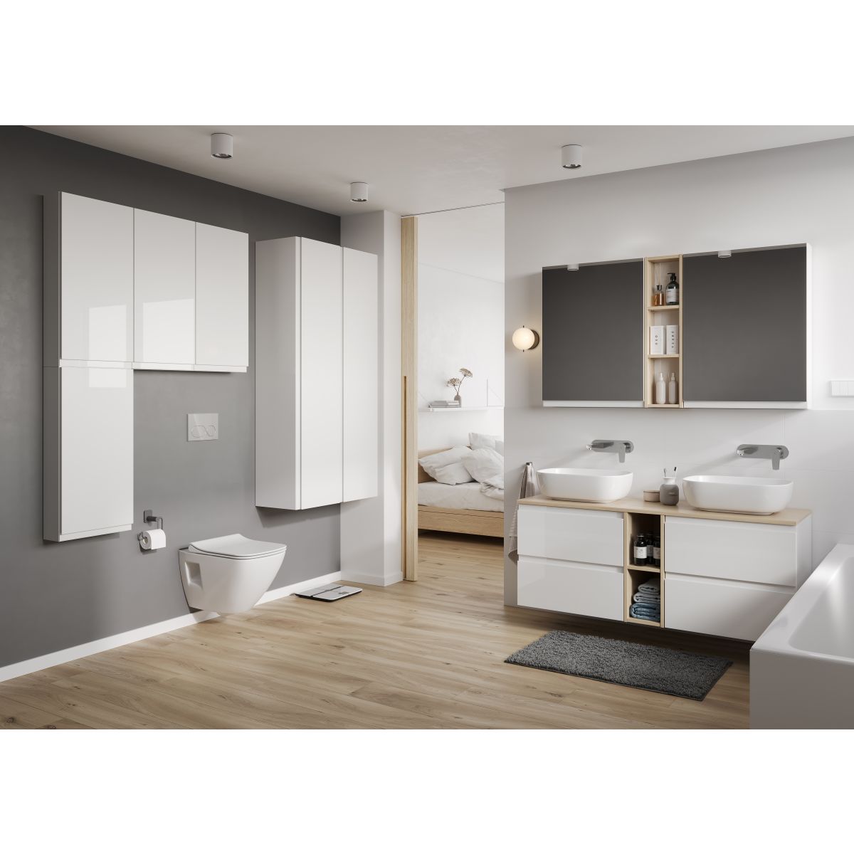Der Hängeschrank MODUO 40 ist für kleine Badaccessoires gedacht. Seine Tiefe ist auf die Spiegelschränke und das offene Modul dieser Kollektion abgestimmt. So lassen sich elegante Einbauten schaffen, die eine einheitliche Fläche über dem Waschbecken- oder Toilettenbereich des Badezimmers bilden. Der Schrank kann horizontal oder vertikal kombiniert werden. Er besteht aus lackierten Möbelplatten. Die Schranktüren haben komfortable gefräste Griffe. Sie sind mit einem Soft-Close-System ausgestattet. Sie können links oder rechts montiert werden. Im Inneren des Schranks befinden sich elegante Glasböden.