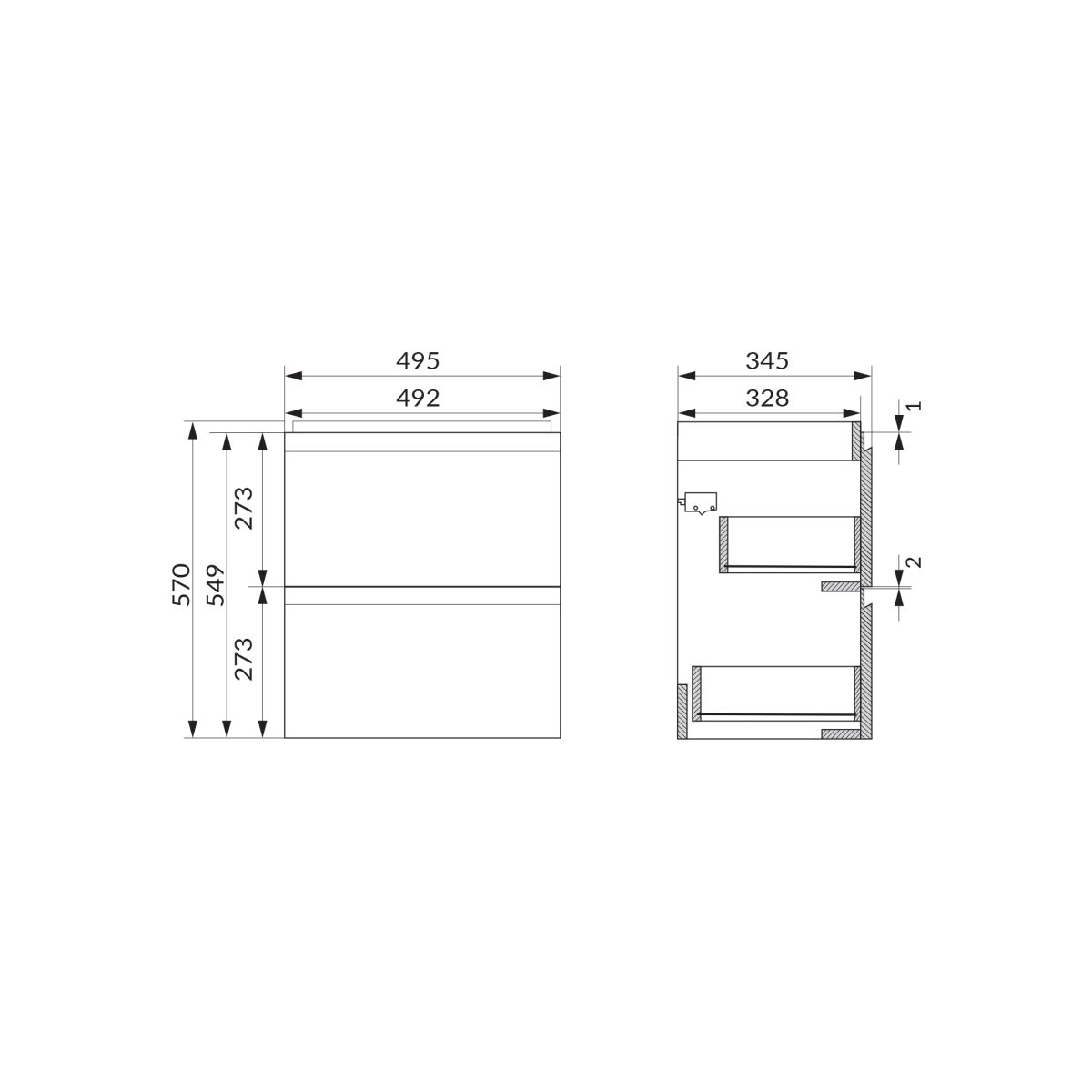 Der Waschtischunterschrank MODUO SLIM mit modernem Design ist aus kaschmirfarben lackierten Platten mit matter Oberfläche gefertigt. Das Modell ist mit komfortablen gefrästen Griffen und einem Soft-Close-System ausgestattet. Dank seiner reduzierten Tiefe kann er sogar in schmalen Räumen montiert werden. So können Sie den Innenraum an Ihre individuellen Bedürfnisse anpassen. Der Schrank ist für die Montage mit dem Waschtisch MODUO SLIM 50 geeignet. Der Schrank verfügt über zwei volle Schubladen, wir empfehlen die Verwendung eines platzsparenden Siphons.