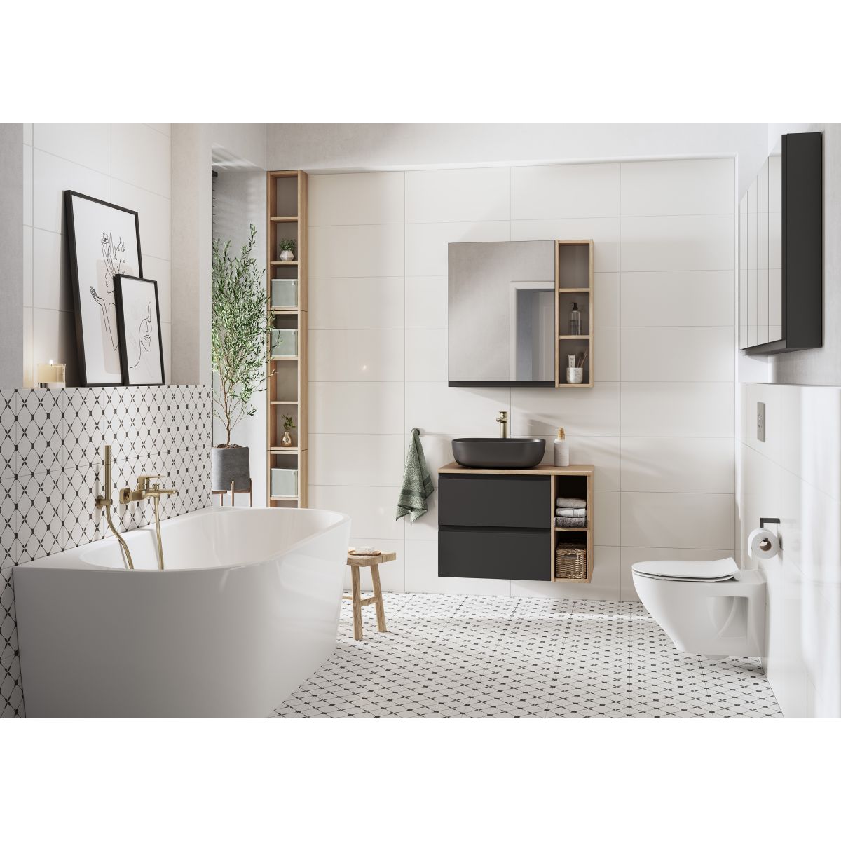Der Spiegelschrank Moduo 60 ist für kleine Badezimmeraccessoires gedacht. Seine Tiefe ist auf die Hängeschränke und das offene Modul dieser Kollektion abgestimmt. So lassen sich elegante Einbauten schaffen, die eine einheitliche Fläche über dem Waschbecken- oder Toilettenbereich des Badezimmers bilden. Der Schrank kann horizontal oder vertikal kombiniert werden. Der Korpus des Schranks besteht aus lackierter Möbelplatte in Anthrazit mit matter Oberfläche. Die Schranktüren sind universell einsetzbar und verfügen über komfortable gefräste Griffe. Sie sind mit einem Soft-Close-System ausgestattet. Im Inneren des Schranks befinden sich 3 Einlegeböden: ein Möbelboden (fest montiert) und zwei Einlegeböden aus gehärtetem Glas. Der Schrank ist zur Selbstmontage vorgesehen.