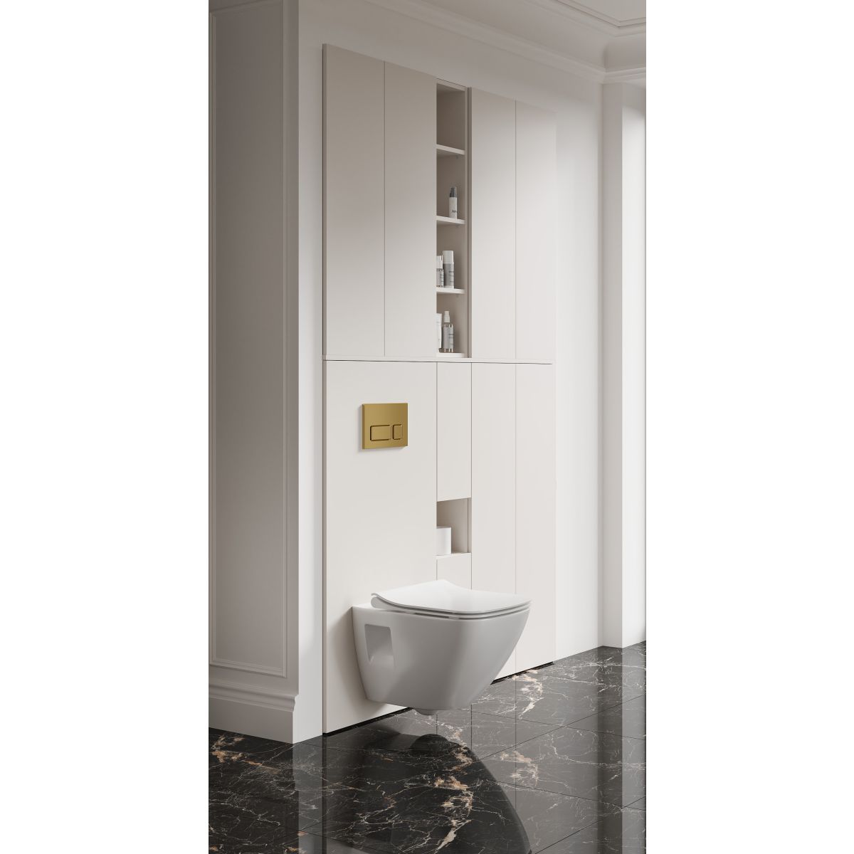 Die Unterputz-Rahmenkonstruktion ist ein weiteres Element, das den modularen Charakter der Moduo-Kollektion unterstreicht. Dank ihrer Ästhetik und einzigartigen Funktionalität ist sie die ideale Lösung für moderne Badezimmer. Die kaschmirmatte Oberfläche verleiht der Verkleidung des Rahmens eine subtile Eleganz, die sich perfekt in andere Elemente der Badezimmerausstattung einfügt. Die Verkleidung des Unterputzrahmens verbirgt effektiv alle technischen Elemente des WC-Systems und verleiht dem Badezimmer ein ästhetisches Aussehen. Dank der Möbelverkleidung des Rahmens können wir den Unterputzrahmen einfach und schnell verbergen, ohne in die Fliesen eingreifen zu müssen. Für diese Verkleidung muss je nach gewünschter Gestaltung eine spezielle Arbeitsplatte erworben werden.