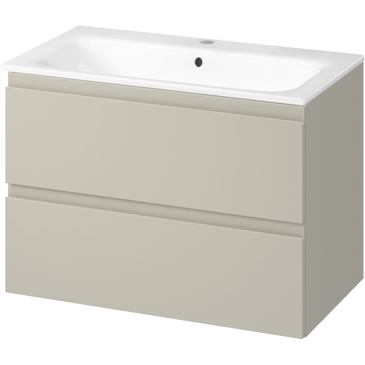 Das Set umfasst einen Waschtischunterschrank MODUO zur Selbstmontage und ein Waschbecken MODUO 80 zum Einlassen in die Arbeitsplatte. Die Front des Schranks besteht aus MDF-Platten, die in der Farbe Kaschmir mit matter Oberfläche lackiert sind. Der Schrank verfügt über zwei volle Schubladen, praktische, gefräste Griffe und ein Soft-Close-System. Wir empfehlen die Verwendung eines platzsparenden Siphons.
