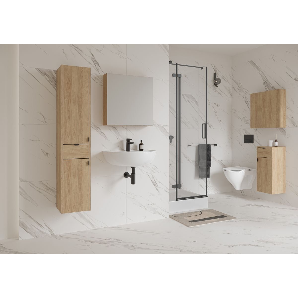 - Serienmäßig ist der Schrank mit schwarzen Metallkantengriffen ausgestattet, die den modernen Charakter des Möbelstücks unterstreichen und einen stilvollen Kontrast zur natürlichen Holzfarbe bilden. Das Möbelstück bietet die Möglichkeit, die Türen rechts- oder linksseitig anzubringen, ist für die Selbstmontage vorgesehen und verfügt über eine 2-jährige Garantie. Der Schrank kann mit den dekorativen Möbelfüßen OVIDA kombiniert werden, die sein Design unterstreichen und der Einrichtung einen individuellen Charakter verleihen.