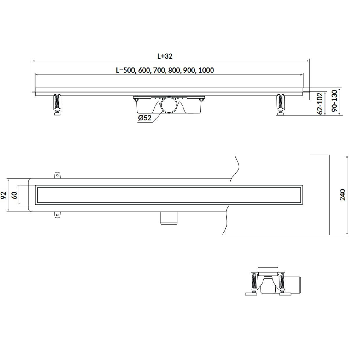 - Im Lieferumfang des Linearablaufs sind alle für die Montage erforderlichen Elemente enthalten (Dichtungsmatte, Füße und Siphon)