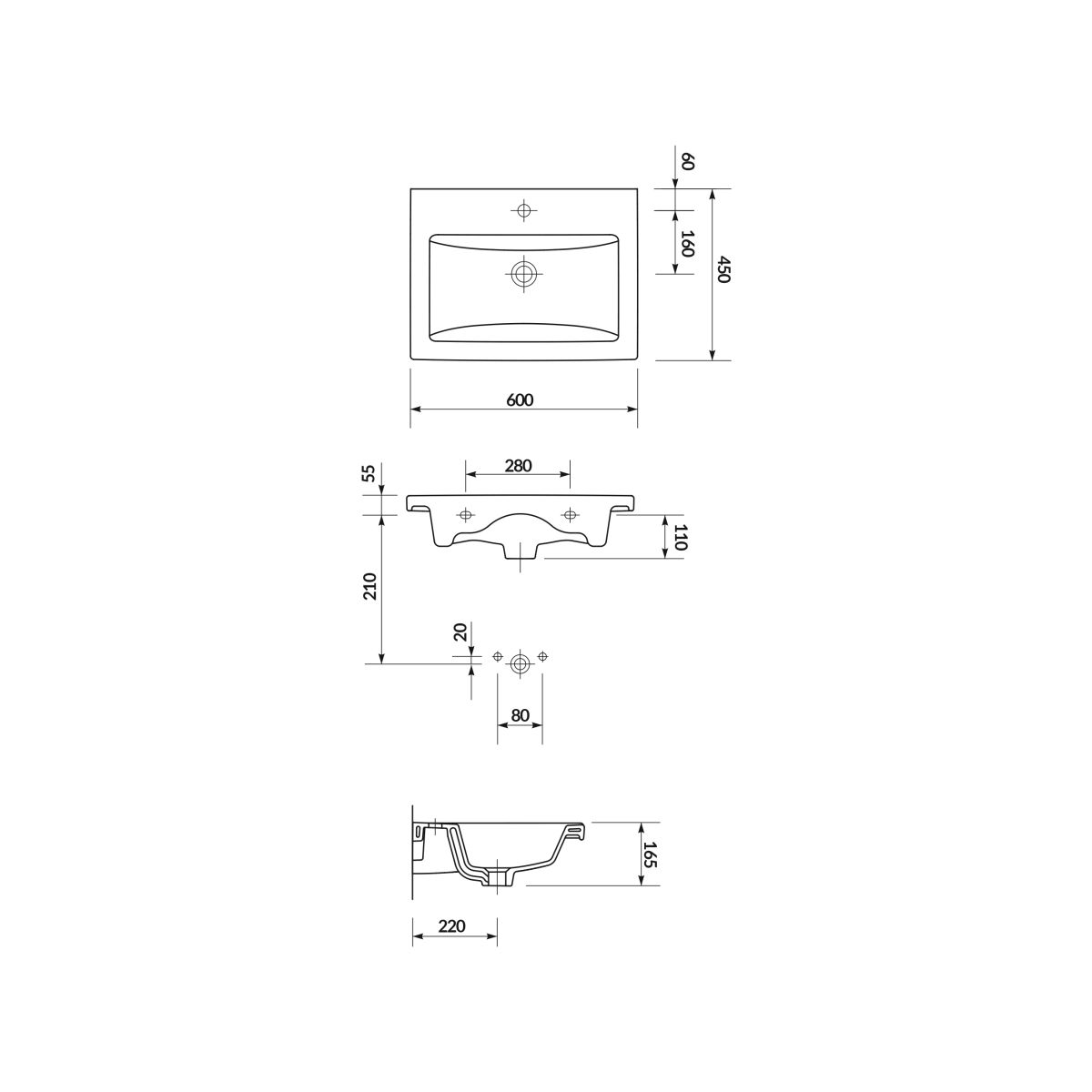 - Waschbecken mit den Maßen 60 × 45 × 1,5