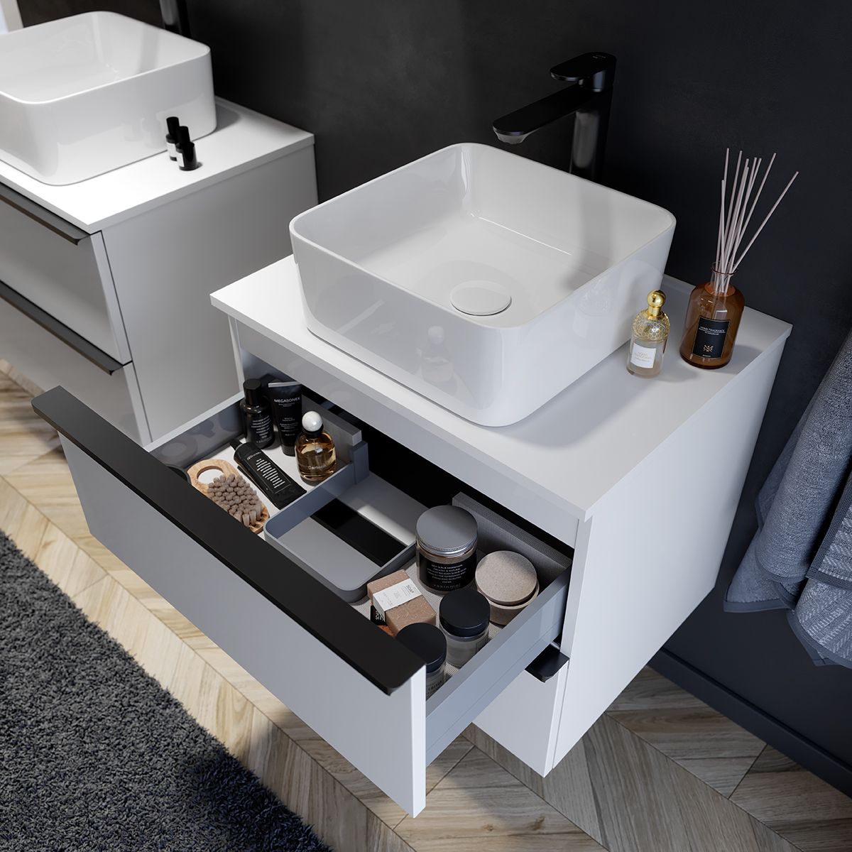 Die Badmöbel aus der Konzeptkollektion VIRGO verbinden Funktionalität, Eleganz und Modernität. Die Schränke dieser Serie verfügen über verchromte Metallgriffe, die perfekt zu den übrigen Einrichtungsgegenständen Ihres Badezimmers passen. Die Schränke mit VIRGO-Arbeitsplatte sind aus weiß lackierter Spanplatte mit glänzender Oberfläche gefertigt. Die beiden praktischen Schubladen sind mit einem Softclose-System ausgestattet. Im Inneren der oberen Schublade befindet sich eine Aussparung für den Siphon mit seiner Abdeckung. Die Oberfläche des Schubladenbodens ist mit einer zarten grauen Leinenstruktur überzogen. Die Möbel werden montiert verkauft.