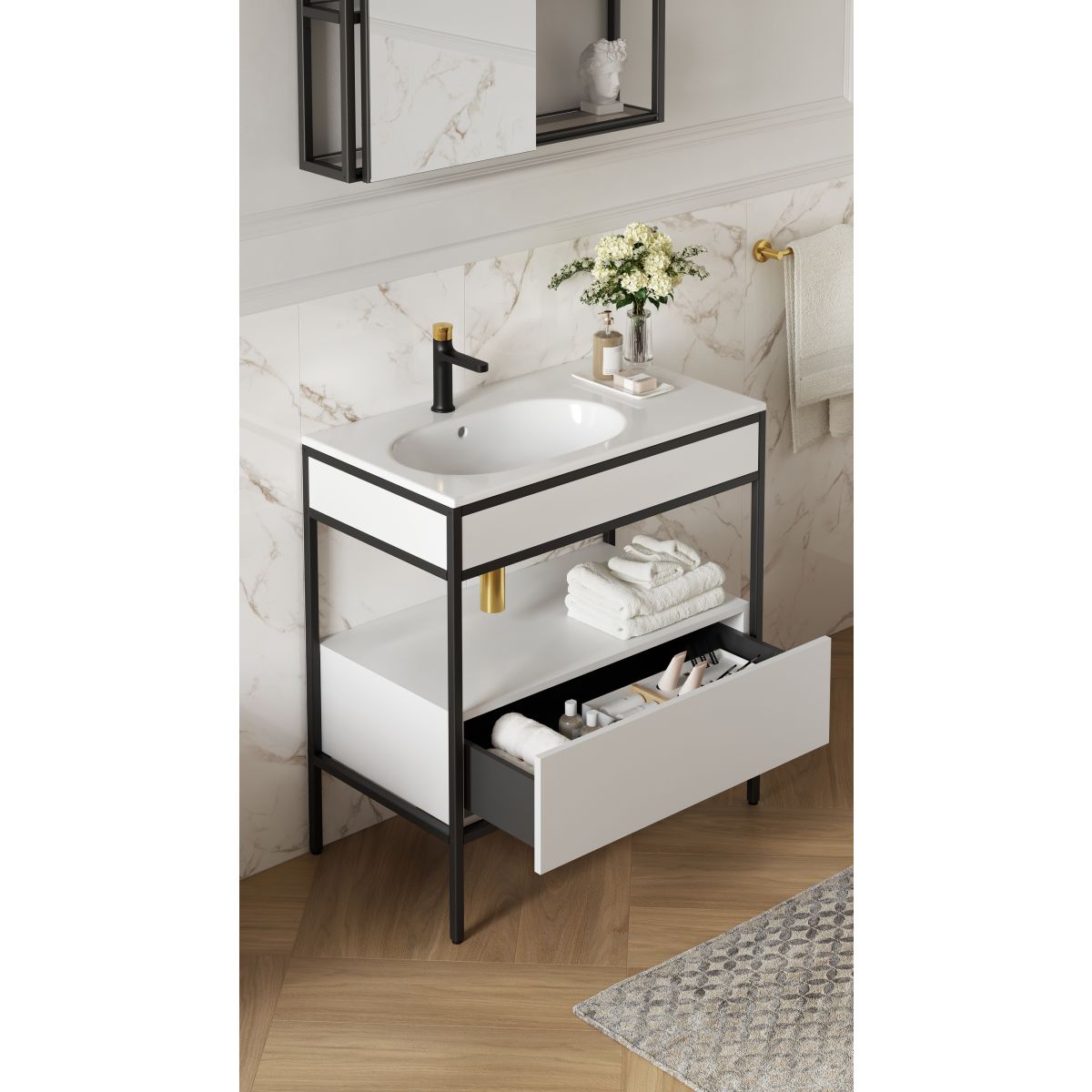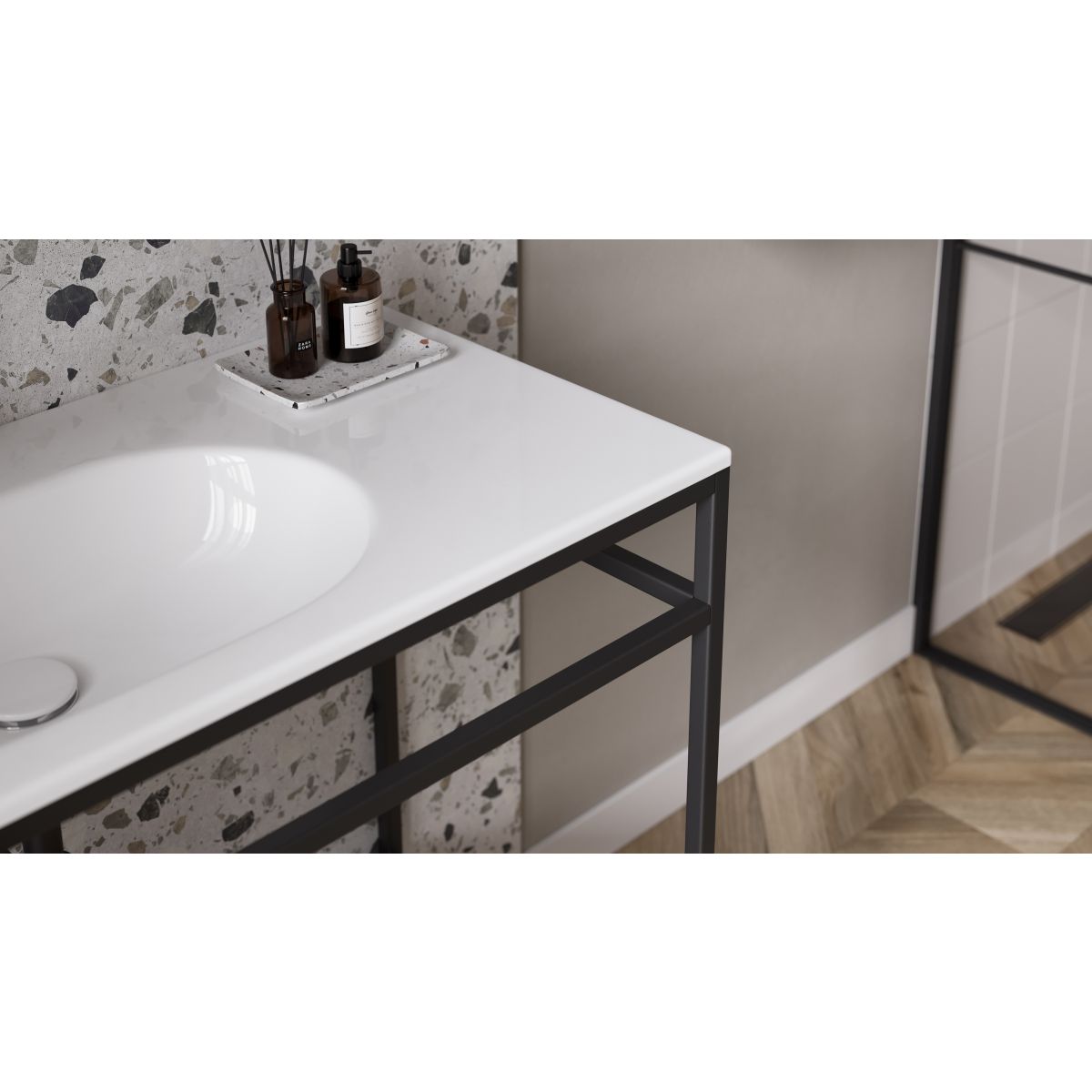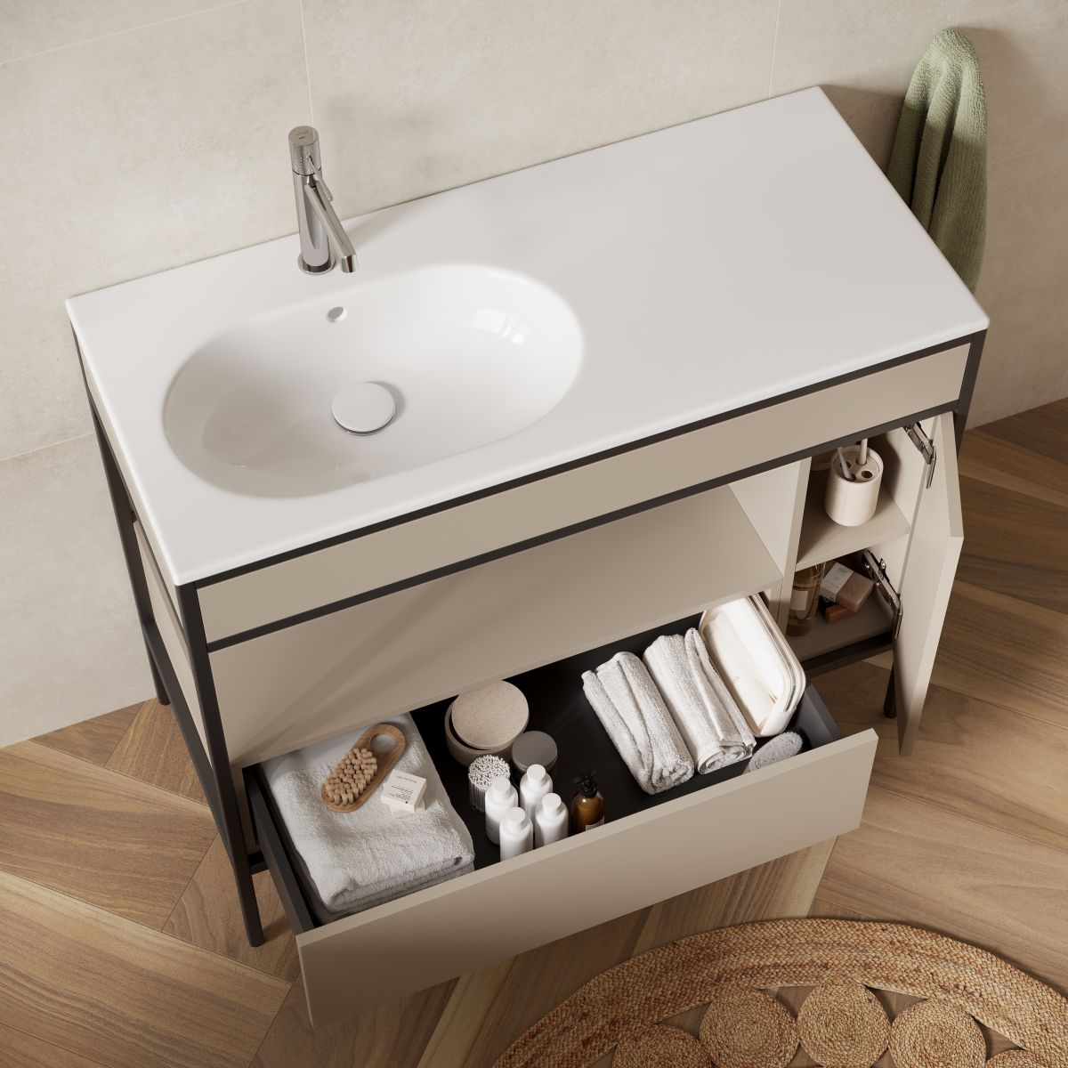 Das Waschbecken ZEN 100 BY CERSANIT mit Keramikplatte – eine optimale Kombination aus der Zweckmäßigkeit einer Keramikschale und der Funktionalität einer Keramikplatte. Das Keramikwaschbecken ist mit einer Öffnung für den Wasserhahn und einem Überlauf ausgestattet und mit den Schränken aus der Larga-Kollektion kompatibel.