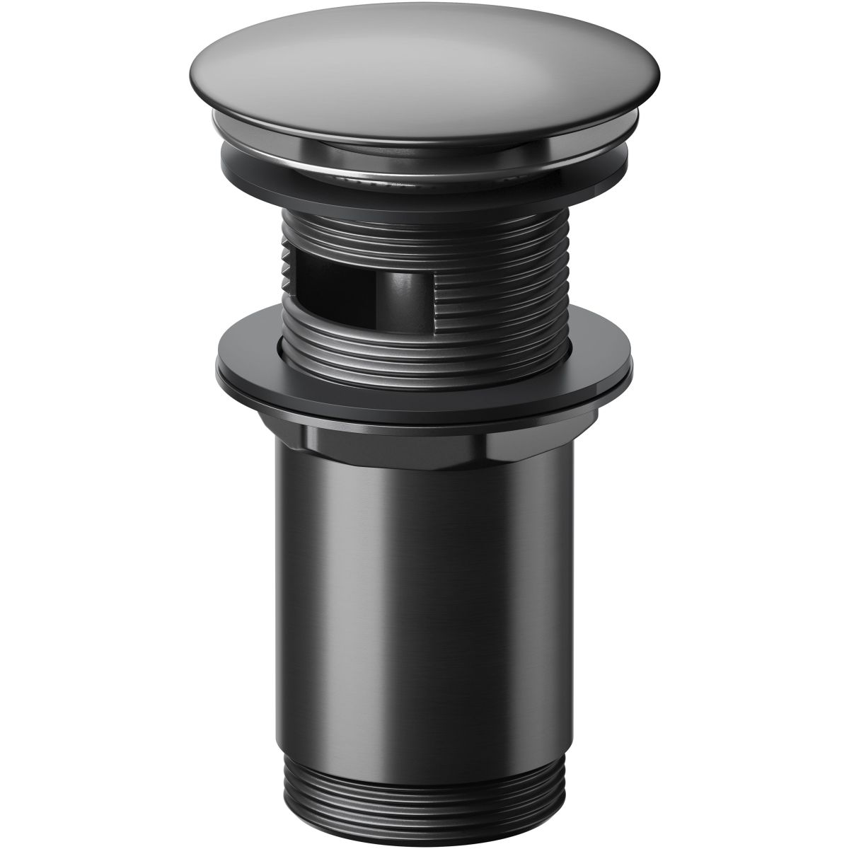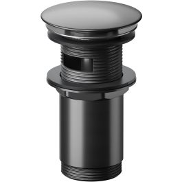 Universeller Waschbeckenstopfen mit automatischem Klick-Klack-Mechanismus in Gunmetal-Farbe, empfohlen für Waschbecken ohne Überlauf oder mit Überlauf. Der Stopfen hat eine 2-jährige Garantie auf alle Teile.