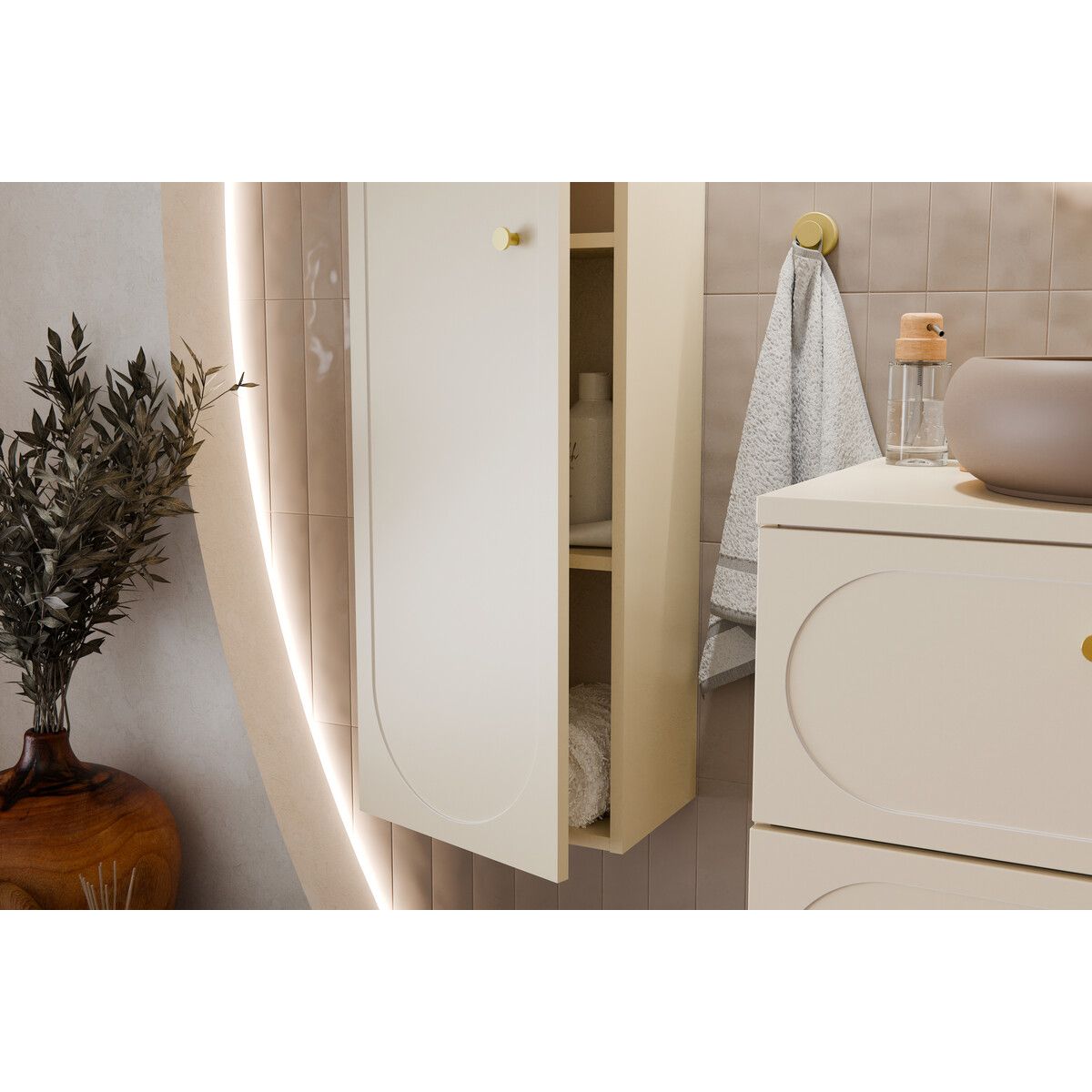 Der hohe Einzeltürschrank aus der Kollektion Donna Sand ist eine moderne Neuinterpretation des klassischen Stils, inspiriert von Subtilität. Die zarten Fronten mit abgerundeten Fräsungen verleihen der Kollektion einen einzigartigen Charakter und Leichtigkeit. Das in der Kollektion verwendete Dekor Sandbeige ist eine Variation der Kaschmirfarben, die die Einrichtungstrends dominieren und Wärme und Harmonie in die Innenräume bringen. Abgerundet wird das Ganze durch goldene Metallknöpfe, die die Eleganz unterstreichen und für ein edles Finish sorgen.