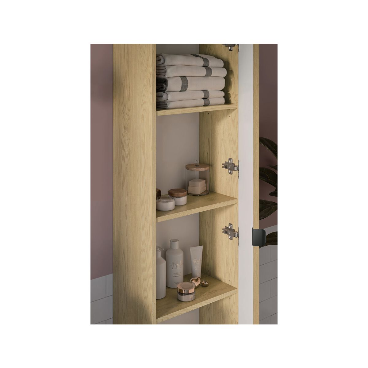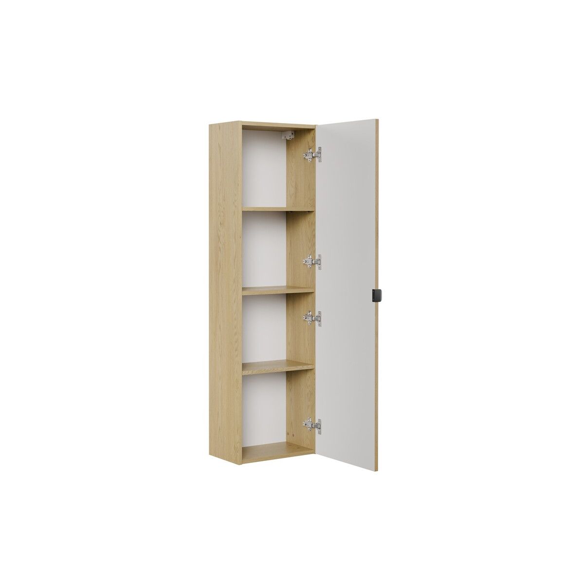 Mit einer Höhe von 140 cm und vier Einlegeböden bietet der Schrank eine kompakte Form bei gleichzeitig großem Stauraum und sorgt für eine komfortable Organisation des Platzes im Badezimmer. Die Möbel sind aus MDF-Platten und laminierten Platten gefertigt und sorgen für ein ästhetisches Aussehen über viele Jahre hinweg. Der Komfort im täglichen Gebrauch wird durch ein Soft-Close-System erhöht, das das Öffnen und Schließen der Fronten reibungslos und geräuschlos macht.