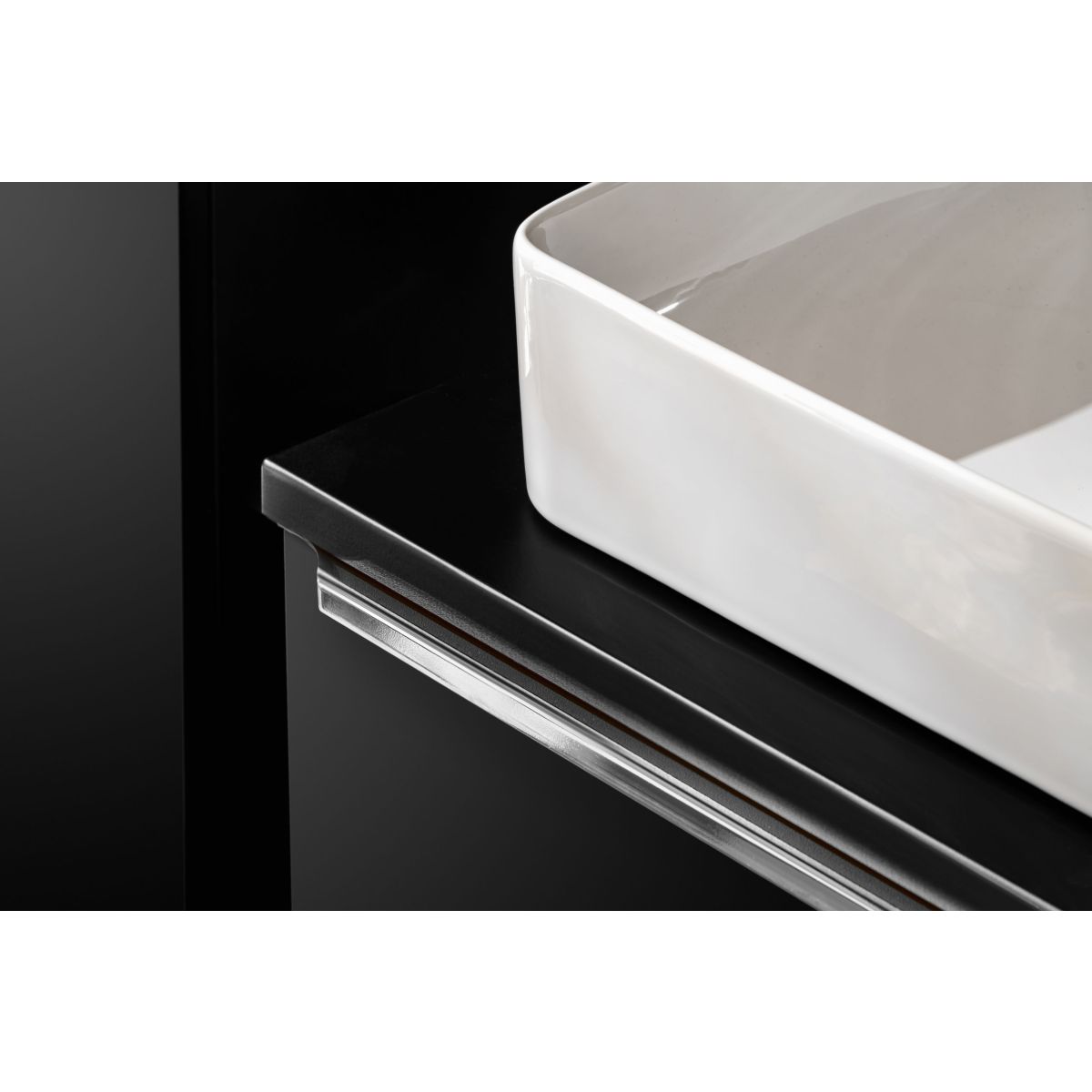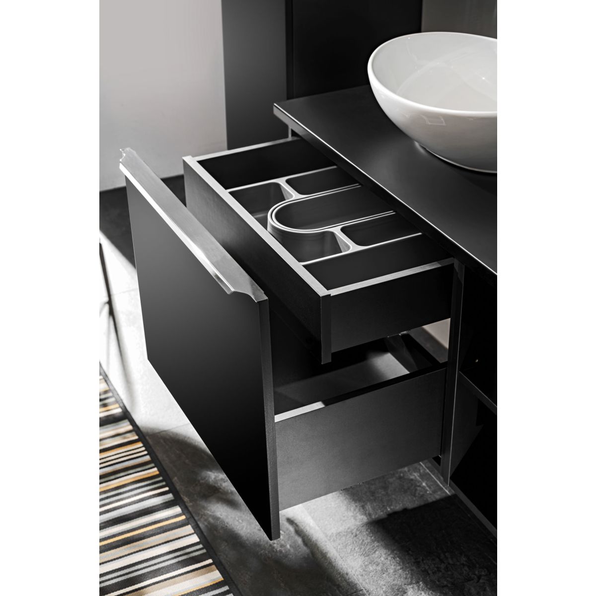SantaFe Black sind Möbelstücke in modernem Stil, die sich leicht in fast jede Einrichtung integrieren lassen. Die Fronten und der Korpus in der Farbe Black Orchid in Kombination mit verchromten Griffen verleihen dem Ganzen Leichtigkeit und Eleganz. Die Spiegelschränke der Kollektion vergrößern optisch das Badezimmer und bieten zusätzlichen Stauraum. Die Badezimmermöbel aus der Kollektion Santa Fe Black sind komfortabel und funktional. Die Kollektion umfasst Waschbeckenunterschränke, einen hohen Schrank, Spiegelschränke sowie Unter- und Oberschränke. Die große Auswahl an Schränken macht diese Kollektion zu einer der modularsten in unserem Angebot, sodass sie sich in Badezimmer fast aller Größen einfügt. Um den Erwartungen unserer Kunden gerecht zu werden, ergänzen wir diese Kollektion um einen Schubladenorganizer. Dieser ist nicht nur funktional, weil er den Siphonausschnitt perfekt verdeckt, sondern bietet auch zusätzlichen Stauraum in der Schublade.