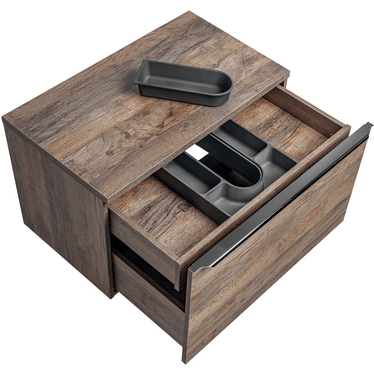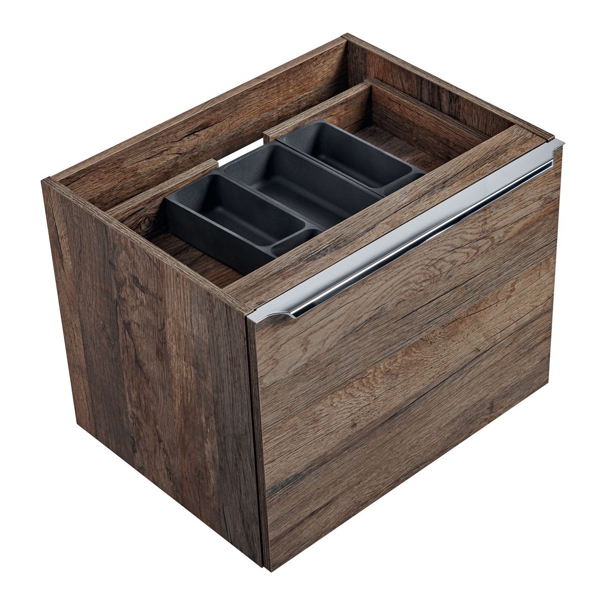 Der Waschbeckenschrank 60 cm aus der Kollektion Santa Fe Oak ist ein Möbelstück in modernem Stil, das sich leicht in fast jede Einrichtung integrieren lässt. Die Fronten und der Korpus in Vintage-Eiche in Kombination mit verchromten Griffen verleihen dem Ganzen Leichtigkeit und Eleganz. Der Schrank verfügt über zwei Schubladen, von denen eine eine Innenschublade ist, die auf den ersten Blick nicht sichtbar ist. Um den Erwartungen unserer Kunden gerecht zu werden, fügen wir dieser Kollektion einen Schubladenorganizer hinzu. Dieser ist nicht nur aufgrund der perfekten Abdeckung des Siphonausschnitts funktional, sondern bietet auch zusätzlichen Stauraum in der Schublade.