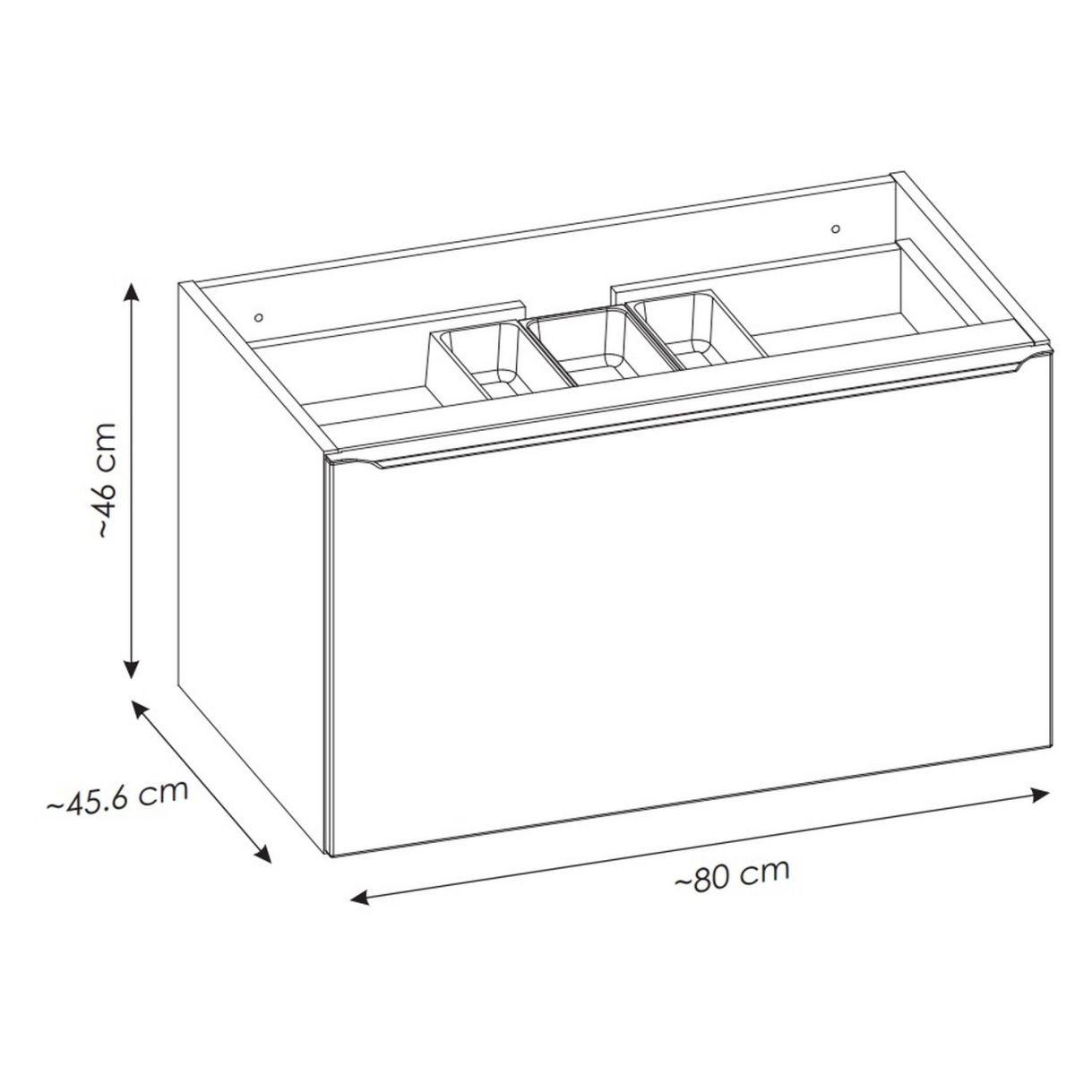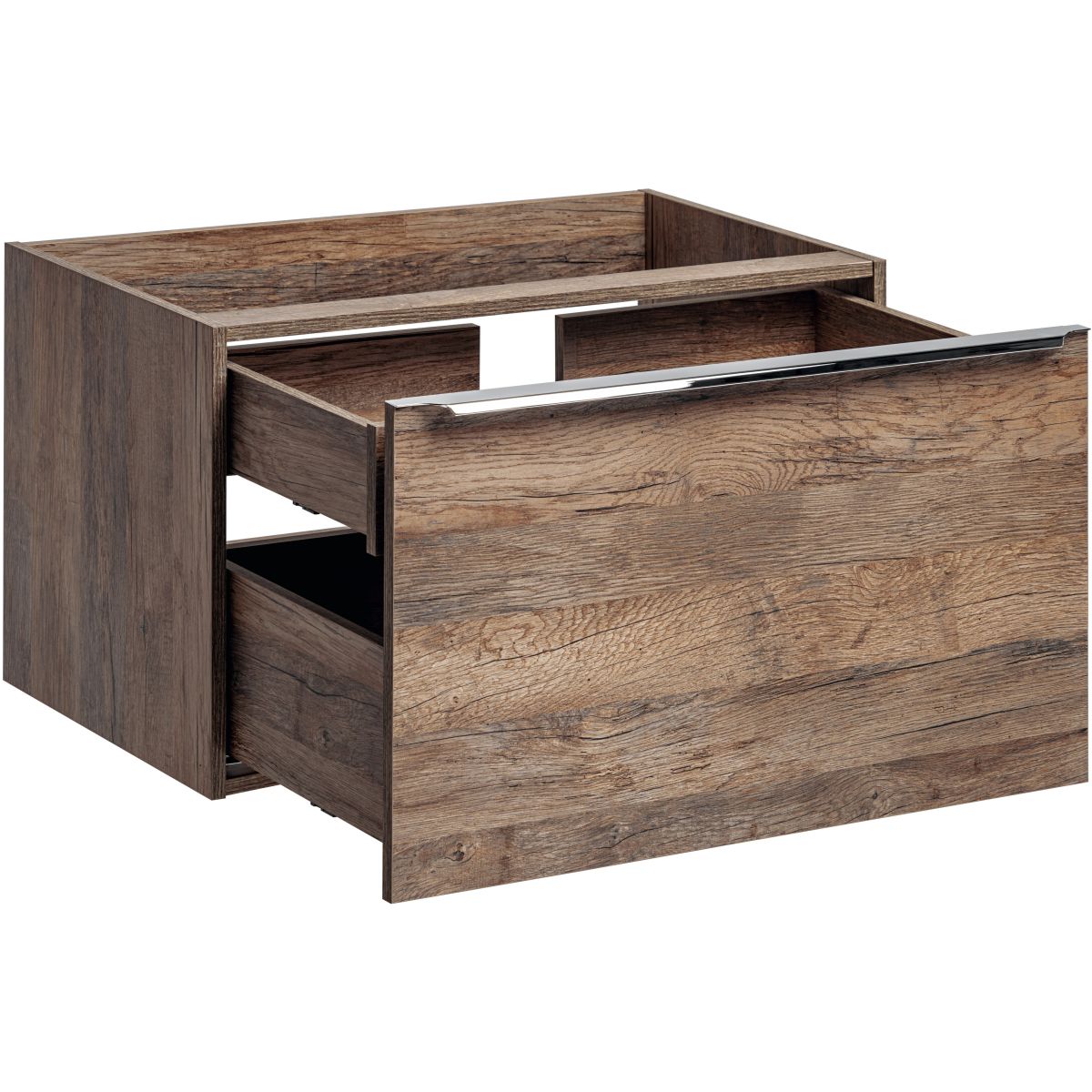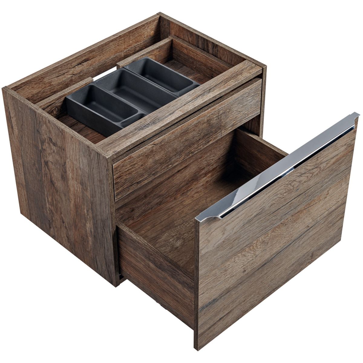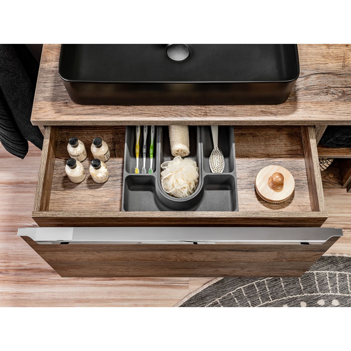 Der Waschbeckenschrank 80 cm aus der Kollektion Santa Fe Oak ist ein Möbelstück in modernem Stil, das sich leicht in fast jede Einrichtung integrieren lässt. Die Fronten und der Korpus in Vintage-Eiche in Kombination mit verchromten Griffen verleihen dem Ganzen Leichtigkeit und Eleganz. Der Schrank verfügt über zwei Schubladen, von denen eine eine Innenschublade ist, die auf den ersten Blick nicht sichtbar ist. Um den Erwartungen unserer Kunden gerecht zu werden, fügen wir dieser Kollektion einen Schubladenorganizer hinzu. Dieser ist nicht nur funktional, weil er den Ausschnitt für den Siphon perfekt verdeckt, sondern bietet auch zusätzlichen Stauraum in der Schublade.