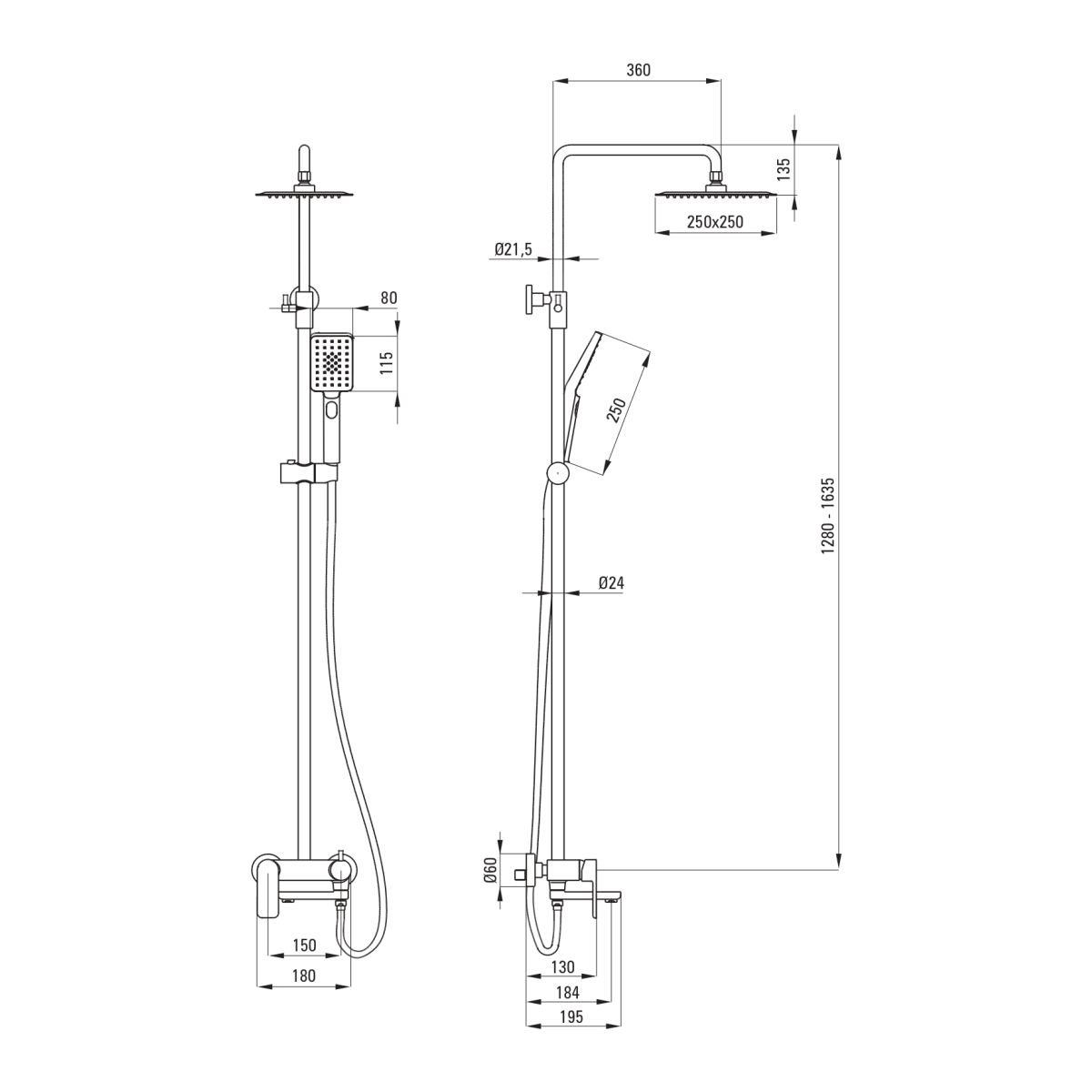 - Reichweite des Dusch-/Wannenauslaufs [mm]: 184